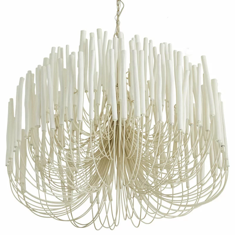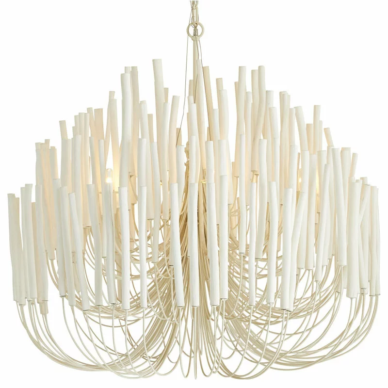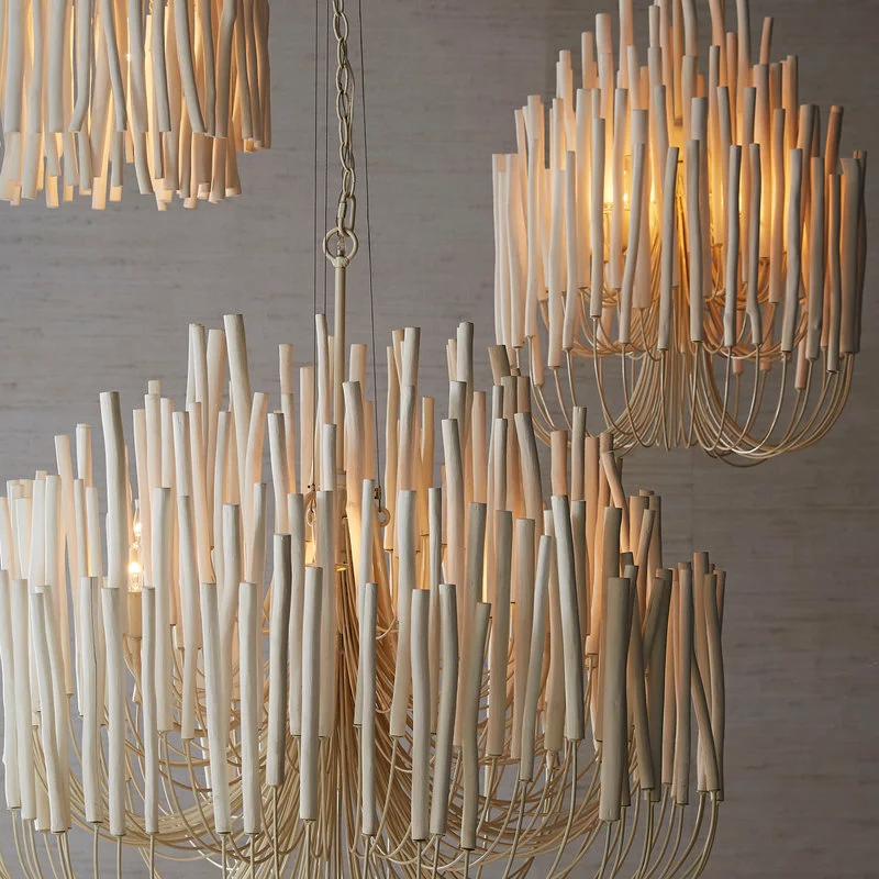 6-light chandelier with several tiers of wooden sticks on curved iron arms, all in a whitewash finish. The wooden dowels are placed atop pliable arms. When switched on, the light glows from within and transforms the space into something magical.
