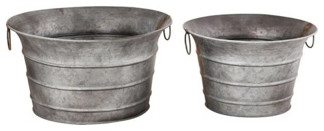 20 Inch Planters (Set of 2) . Set of 2 Planters. Features: Product Type: Decorative Accessory Garden ItemGood For Outdoor: YESMaterial: Galvanized SteelStyle: TraditionalSub Style: Modern Farmhouse / Multi-Piece Dimension 1 (inches): 20x20x11Multi-Piece Dimension 2 (inches): 10x16x16