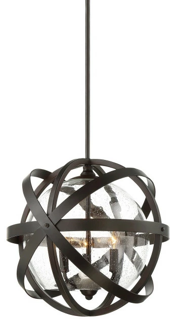 3 Light Outdoor Pendant-Modern Farmhouse Style with Rustic and Transitional Inspirations-16.57 inches tall by 17.05 inches wide . Indoors or out the Appleby Newydd pendant provides your home with artful illumination. The intersecting round bands of the frame encircle an orb of lovely seeded glass: plenty of visual textural interest but symmetrically pleasing to keep the mood serene. The frame has a wonderful English bronze finish and three 60W candle-style bulbs inside the clear glass allow ample light. Youll love the sculptural design of this pendant in your dining area kitchen family room foyer living room or office. And its UL rated for damp locations so ideal for your sunroom porch pergola or other covered outdoor living areas too. Includes extension rods and a 30 degree swivel to adjust the hanging height and accommodate sloped ceilings as needed.