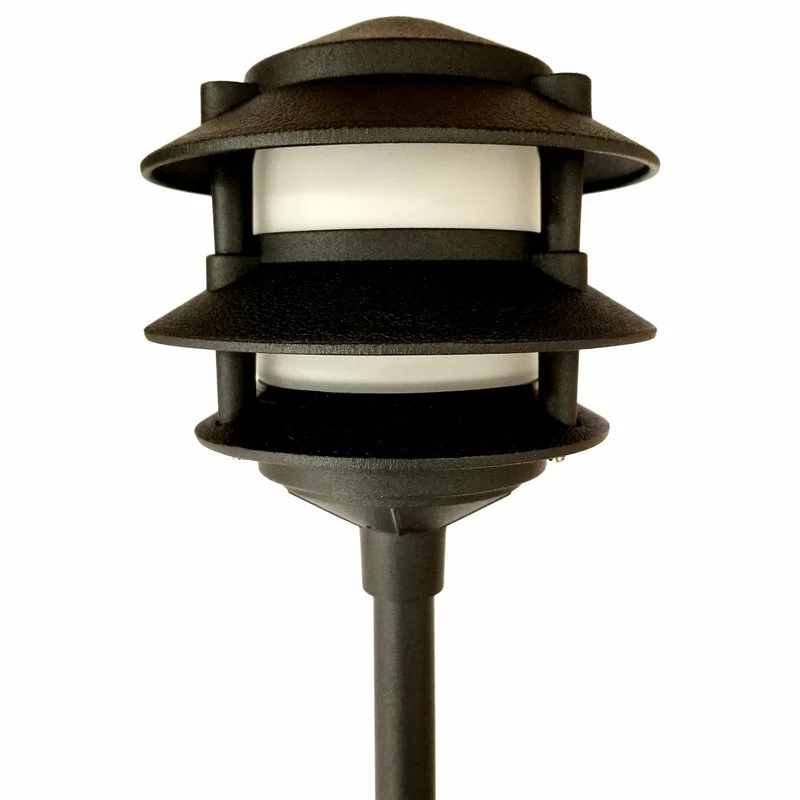 Best Pro Lighting’s contractor grade 3 Tier Pagoda Pathway Light in Powder Coated Black Finish will give a classic and traditional accent to your garden area or pathways. Gives off light in a 360° spread so you can place it centrally in any areas that you would like to be illuminated. With a solid cast aluminum construction in a powder coated finish that is weather resistant. The best applications for these fixtures are: along pathways, low level perimeter lighting, garden bed lighting, area lighting, accent lighting and walkway lighting. These 3 Tier Pagoda Pathway lights feature a frosted glass globe enclosed in a three tiered housing. Includes a Ground Stake. This fixture requires the usage of a Low Voltage (12-Volt) lighting transformer. Wire nuts and connectors are not included.