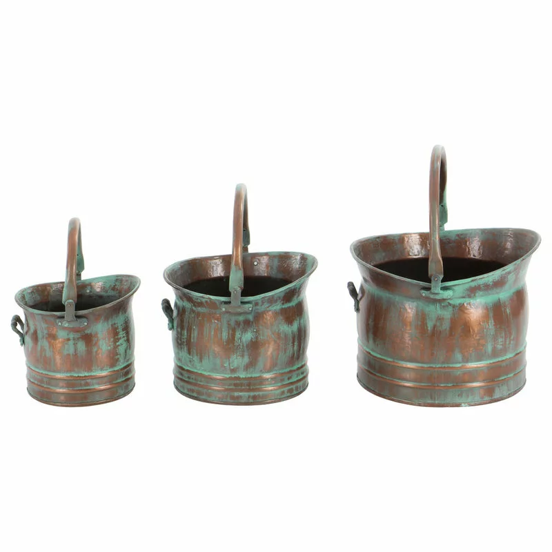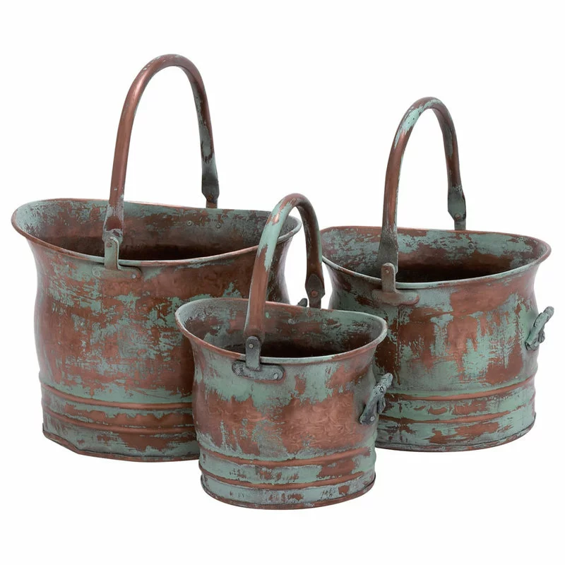 These stylish copper plant holders are great additions to gardens, patios, and living spaces with a rustic or farmhouse theme. This item ships in 1 carton. Please note that this item is for decorative purpose only and is not food safe. Suitable for indoor and outdoor use. Maximum weight limit is 20 lbs. Made in India. Planters do not have drainage holes but they are not watertight. This planter comes as a set of 3. Rustic style.