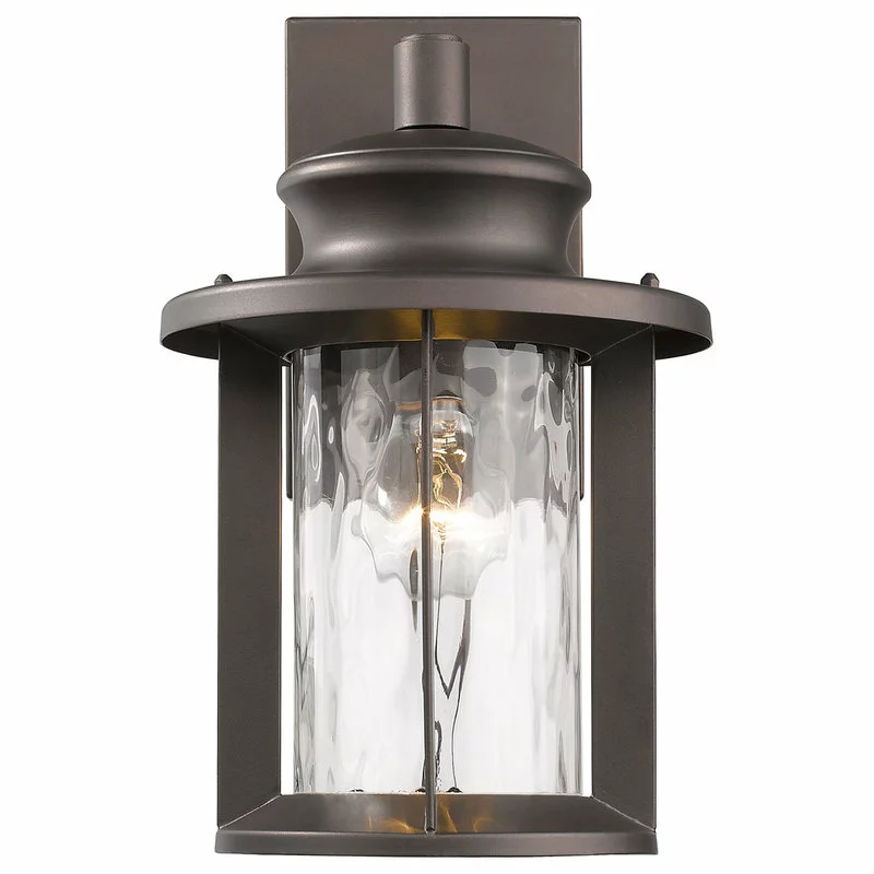 This 1-light outdoor wall lantern features an oil rubbed bronze finish that will complement many transitional decors. The clean lines of the steel frame adds interest while the clear water glass gives the light a whole new look for your outdoor decor.