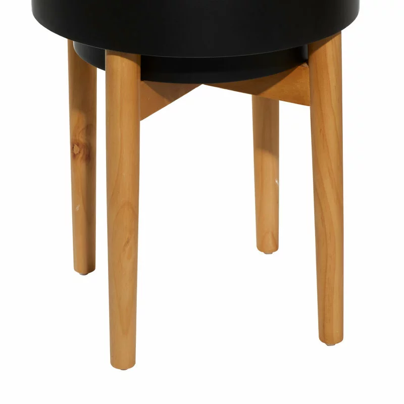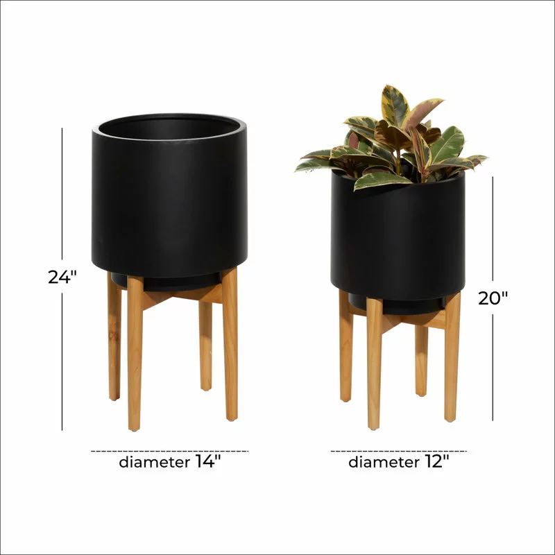 Connect some greenery to the seamless flow of your mid-century inspired living space with this 2-piece set black metal and wood standing planter. This wood and metal-combination standing planter features a smooth transition between its materials thanks to its perfect circular design. The black metal planter features a smaller portion at the bottom to fit perfectly between the 4 wooden legs and for the main compartment to hold more soil for your plants. The wooden legs are widely spaced for a better center of gravity thus giving you peace of mind when displaying. The interconnectedness present in this design is excellent for your living room, dining room, home office or entry way. Ships in 1 carton. Suitable for indoor use only. No drainage holes. Each set includes with 2 planters. Contemporary design. Planters do not have drainage holes but they are not watertight.