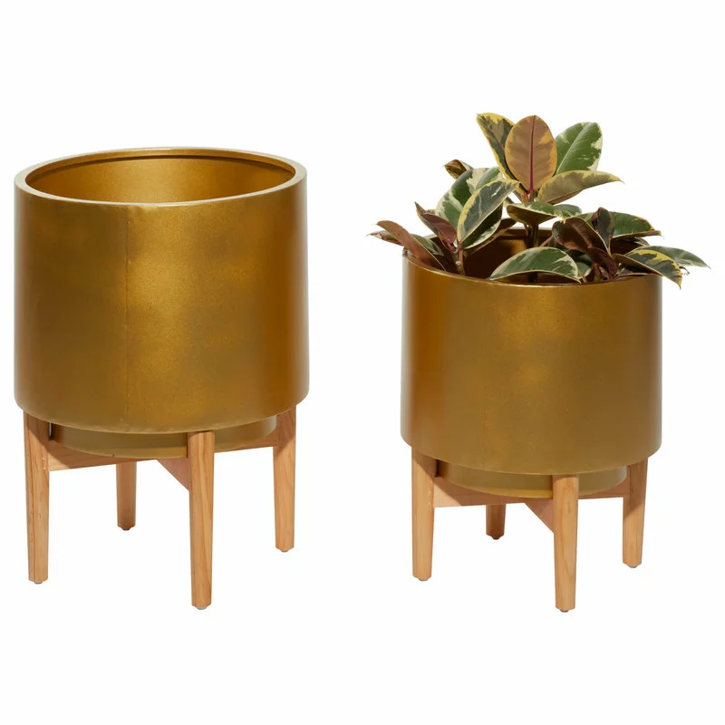 Connect some greenery to the seamless flow of your mid-century inspired living space with this 2-piece set gold metal and wood standing planter. This wood and metal-combination standing planter features a smooth transition between its materials thanks to its perfect circular design. The gold metal planter features a smaller portion at the bottom to fit perfectly between the 4 wooden legs and for the main compartment to hold more soil for your plants. The wooden legs are widely spaced for a better center of gravity thus giving you peace of mind when displaying. The interconnectedness present in this design is excellent for your living room, dining room, home office or entry way. Recommended for use with indoor plants that do not require much water or sunlight, since there is no drainage hole. This item ships in one carton. Planters do not have drainage holes but they are not watertight.