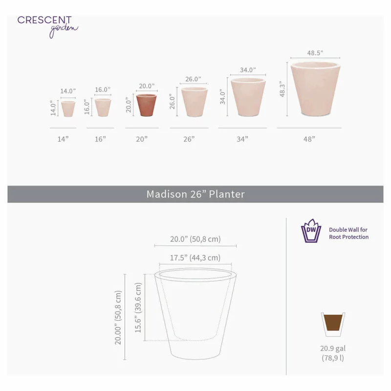 Protect and highlight your plants at the same time with the lightweight Madison Planter from Crescent Garden. This double-wall planter insulates the roots against the changing temperatures so your plants can thrive both in hot summers and cold winters. Pre-drilled drainage holes make sure your plants get just the right amount of water. Add a matching or contrasting saucer if you’re keeping your plants indoors for a beautiful look you can enjoy year-round.