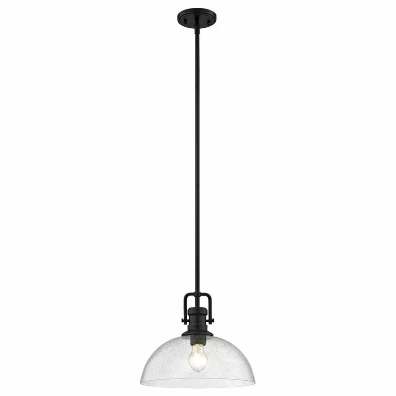 Farmhouse industrial style black 1-light pendant light with seeded clear glass shade.
