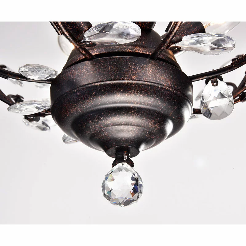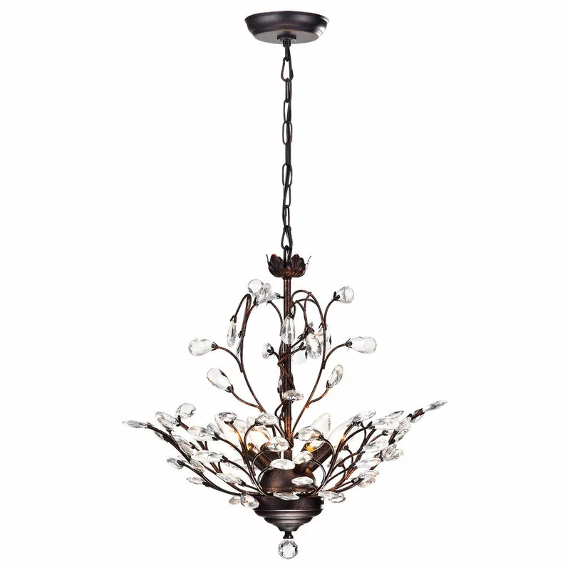 This exquisite beauty captures the imagination with its entwining antique copper metal branches and crystal leaf design. Reminiscent of a spring branch bursting with newly formed leaves, this artistic chandelier is destined to be the focal point. The iron “branches” wrap around the four candelabra style lights while its cut crystal leaves capture the light from all angles. The 39-inch chain is adjustable and can be hung at any length.