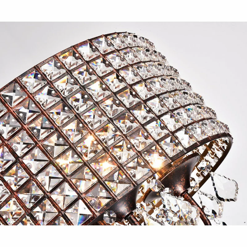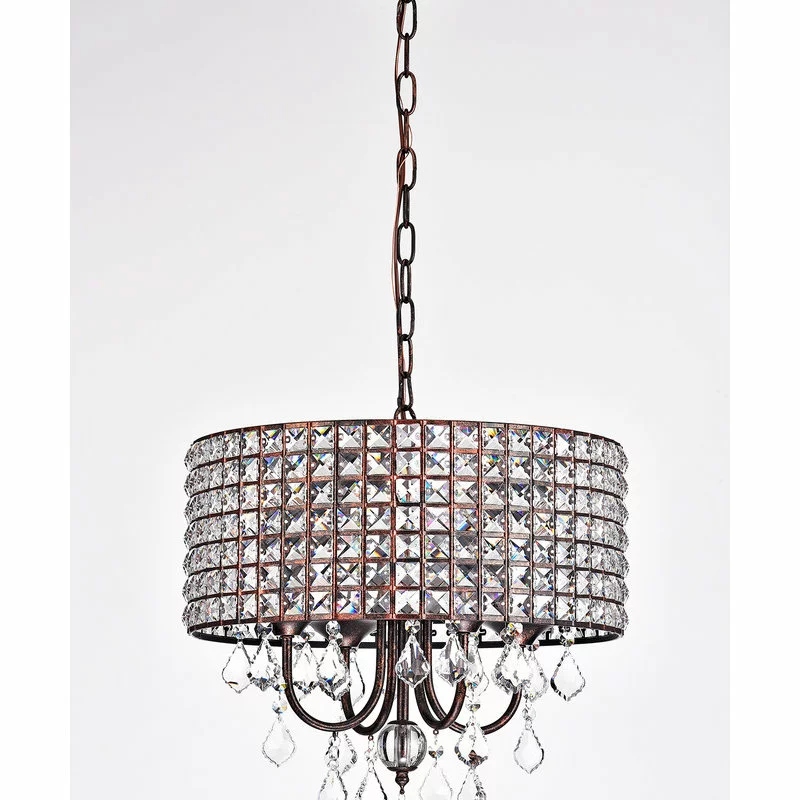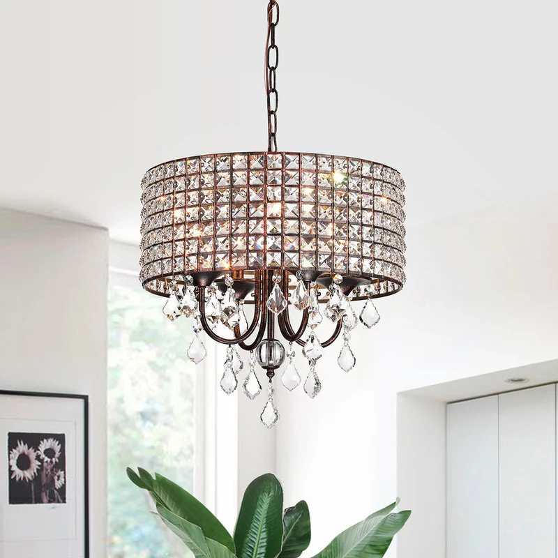 This unique beautifully opulent chandelier is the picture of contemporary perfection; it features antique copper hardware, crystal latticed drum shade and two layers of cascading crystals. The up lighting and 4-Light design cast a glow in the room that is low yet powerful and sets a mood of drama and romanticism that is perfect for any room. The chain is 39 inches long and is adjustable. It can be shortened by removing some links, which makes it perfect for practically any ceiling height or room size.