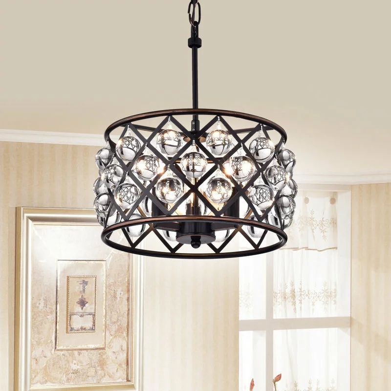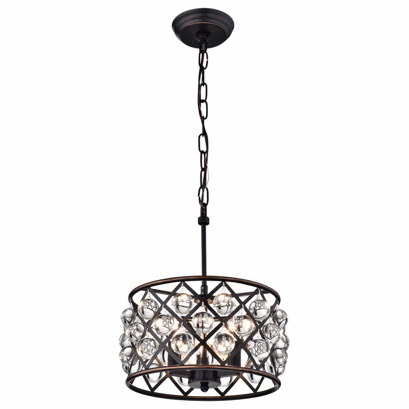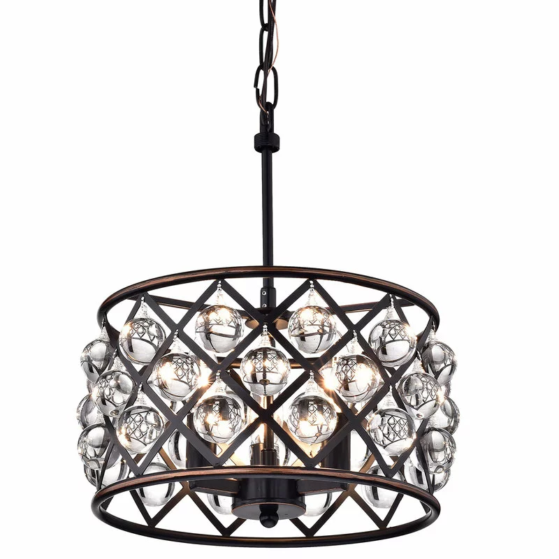 This ornate round chandelier is the picture of contemporary perfection. The spherical crystals drip down from its oil rubbed bronze latticed hardware. Another stunning piece in the Azha collection this one takes three candelabra style bulbs. The chain is 39 inches long and is adjustable.