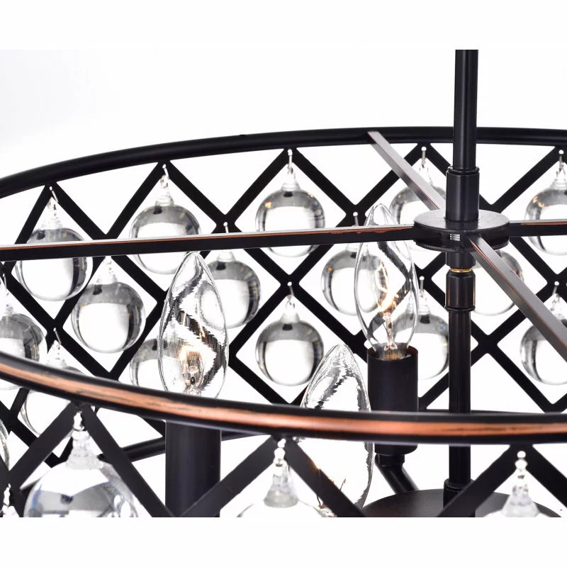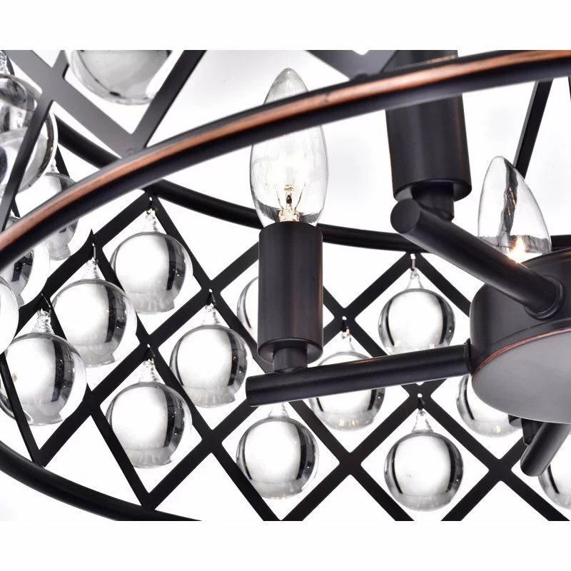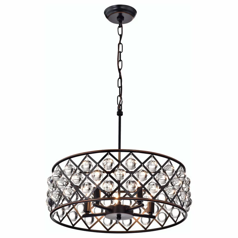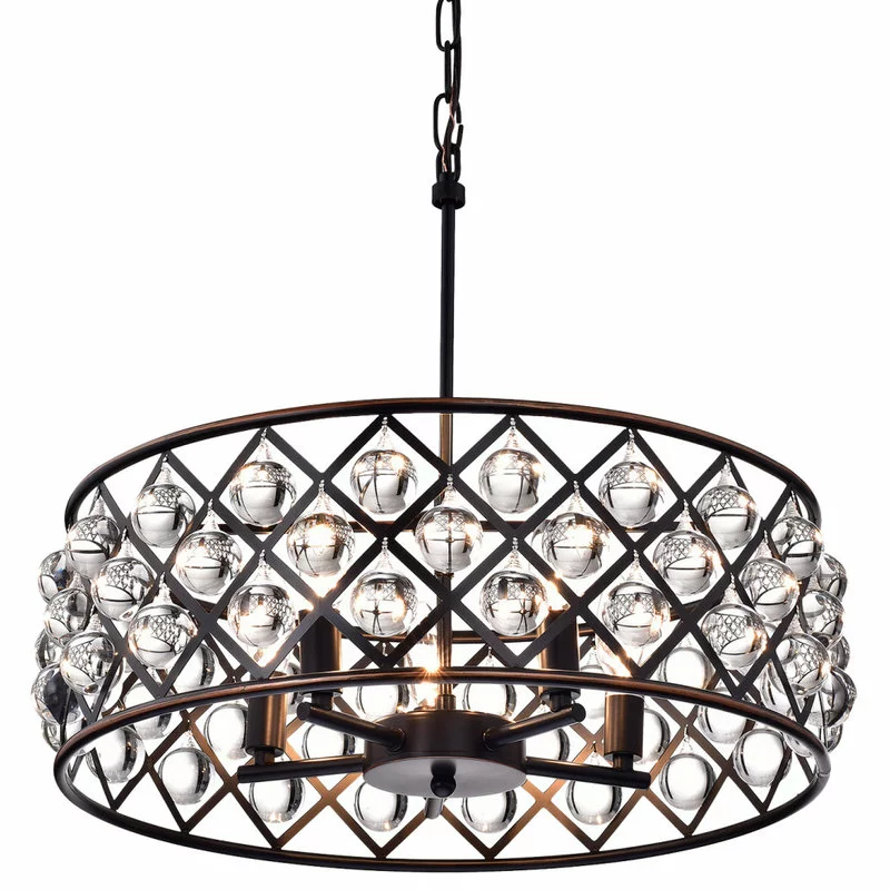 This unique Azha pendant lamp blends contrasting lines and materials for a modern take on a traditional chandelier. The oil-rubbed bronze structure provides a complex frame for the round crystal spheres that decorate its edge. They reflect the light from five central bulbs for an intriguing illuminating effect. With its traditional materials and ornate details, Edvivi LLC’s Azha pendant lamp exudes a timeless elegance.