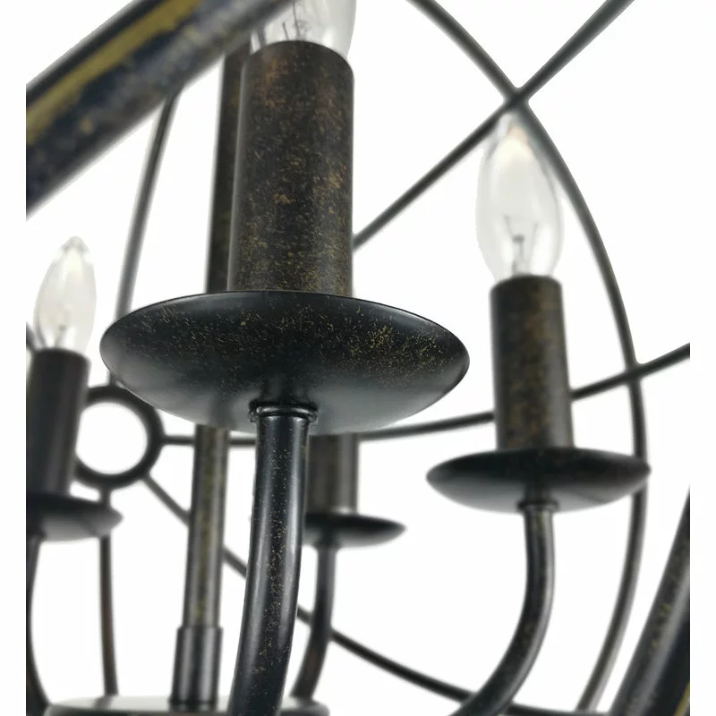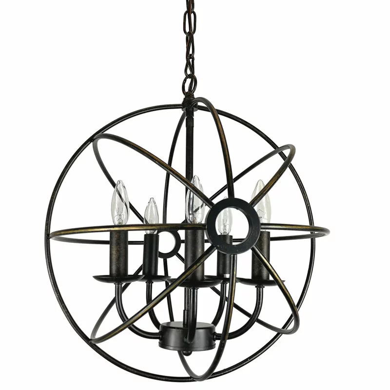 With a clean, symmetrical design, the Antique Bronze Globe Chandelier is an elegant entryway or living room centerpiece. Its antique bronze hardware utilizes fine gold accents and five candlelight bulbs to create a cozy, warm light. This sophisticated chandelier from Edvivi LLC comes with an adjustable 40-inch chain and adds depth and character to any room.