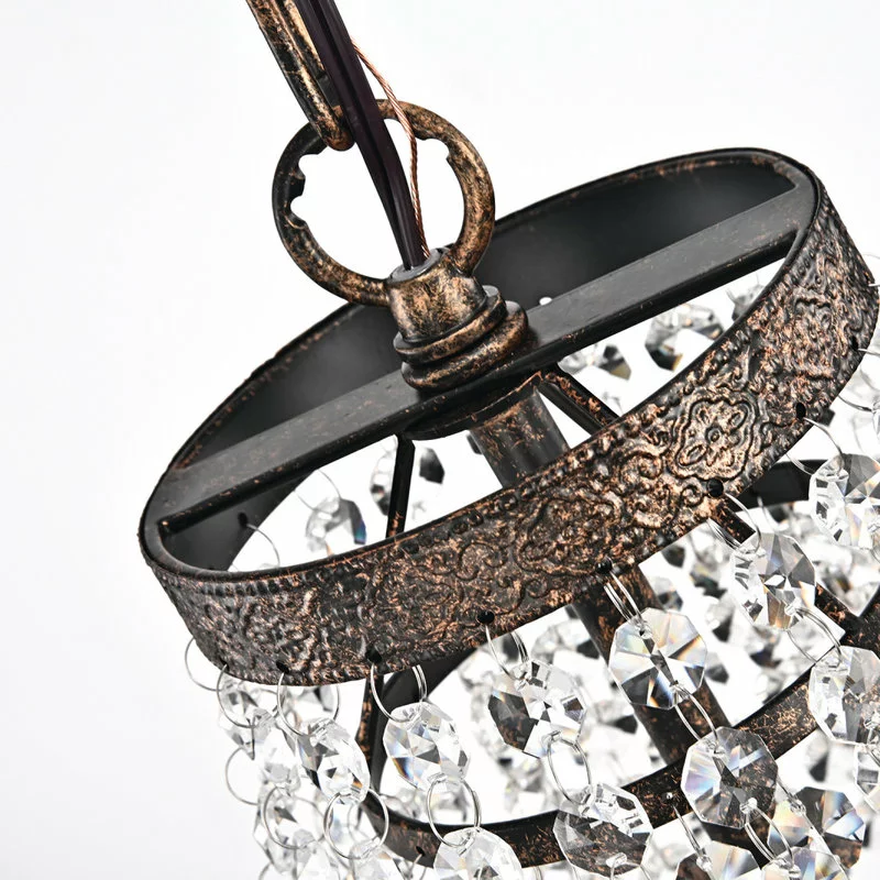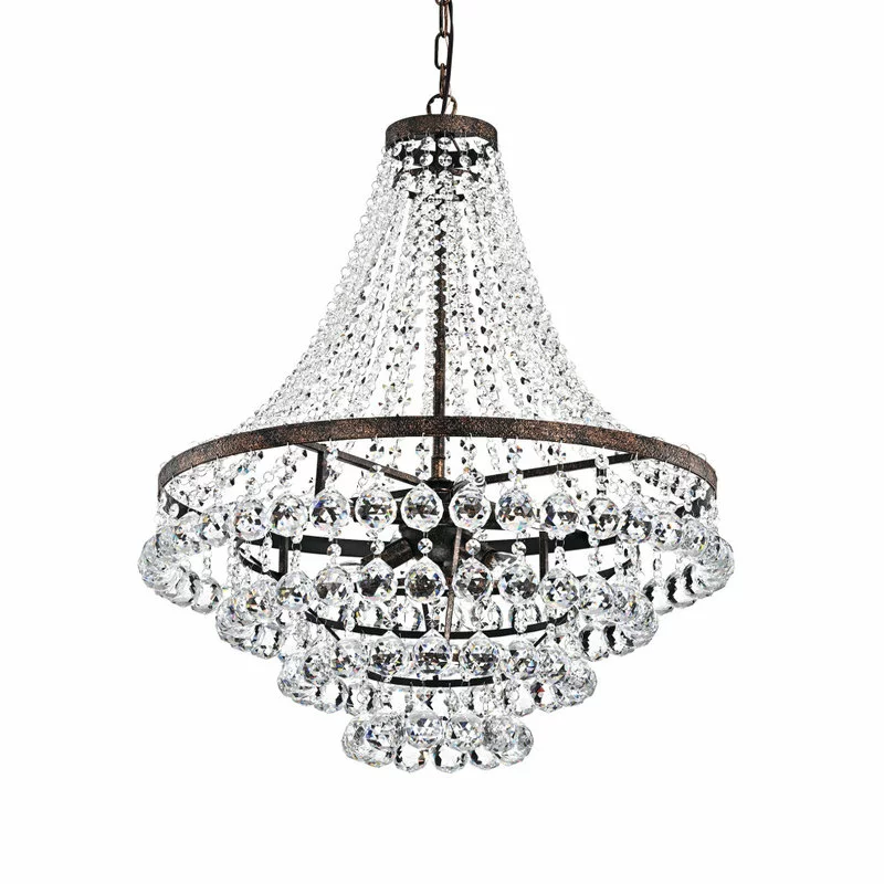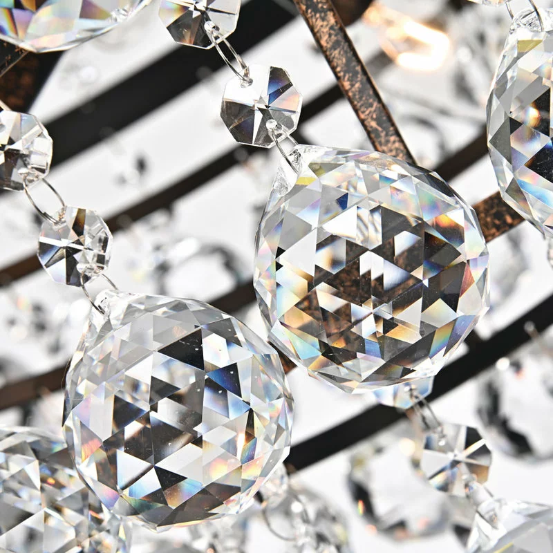 This dazzling empire shaped, four-tier Towne Park chandelier creates a focal point in your space. The stamped details on the antique copper bands create added details to this stunning fixture. The layers of cut crystals make this piece stand out. It comes with a 40-inch chain that can be adjusted by removing links.