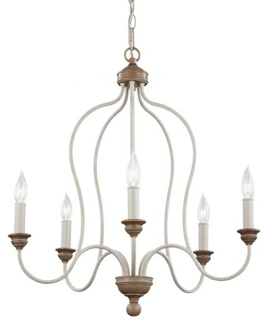 The Feiss Hartsville five light single tier chandelier in chalk washed / beachwood is the perfect way to achieve your desired fashion or functional needs in your home. The sweeping silhouette of the Hartsville lighting collection by Feiss was inspired by the farmhouses and country life of the Colonial American heartland. With soft, distressed finishes of Dark Weathered Zinc coupled with Weathered Oak detailing or a Chalk Washed finish paired with Beachwood detailing, these designs are perfect in any number of settings from traditional to coastal casual decor. The assortment of incandescent fixtures includes 3-light, 5-light and 9-light chandeliers, a 6-light island chandelier, a 1-light mini-pendant, as well as 1-light and 2-light wall sconces.