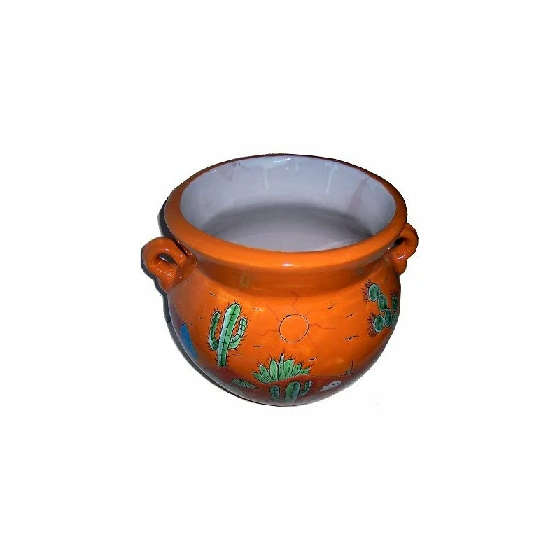 This pot has a terracota/orange background perfect for a sunny desert landscape. The motif on the pot is masterly handpainted by Mexican artists in a desert theme: Full of cactus, dried bones and lots of sand. There is a guy and its burro” walking around the dunes, looking for something to pick up. A unique addition to your garden landscape! The dimensions shown are overall dimensions, the pot opening is 10″ diameter.Talavera Ceramic pots have a drilled hole at the bottom; this enable them to be used as a planter. If you plan to use them for this purpose, we recommend to use a smaller plastic planter to put it inside; this will prevent rusting to happen and will give a longer life to the pot. This ceramic pot is just an example of the exquisite beauty the Mexican craftsmen put on each item they create. It is handcrafted and handpainted, which means that no pots are the same! There might be small differences in size, weight and even the paintings. If you want to delight somebody special with an unique handcrafted gift, this is what you are looking for!”