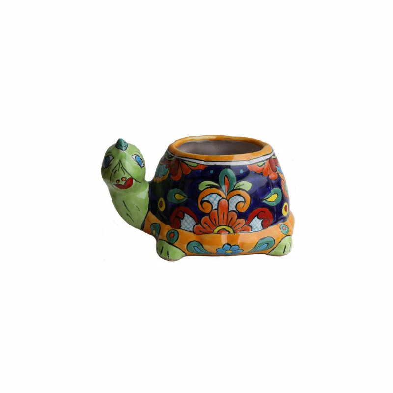 This planter has a beautiful turtle shape, painted with the traditional Talavera dark blue background and flowers of different colors and kinds in the foreground. The legs, neck and head are solid dark green to make a ideal combination for your garden. Mexican Talavera ceramic is the result of a mixture of cultures over the time. The Spaniards were influenced by Arabic pottery, they brought it to Mexico and the mixture of cultures gave as result these beautiful art in ceramic. This ceramic planter is just an example of the exquisite beauty the Mexican craftsmen put on each item they create. It is handcrafted and handpainted, which means that no planters are the same! There might be small differences in size, weight and even the paintings. If you want to delight somebody special with an unique handcrafted gift, this is what you are looking for! It will be a nice addition to your garden landscape.