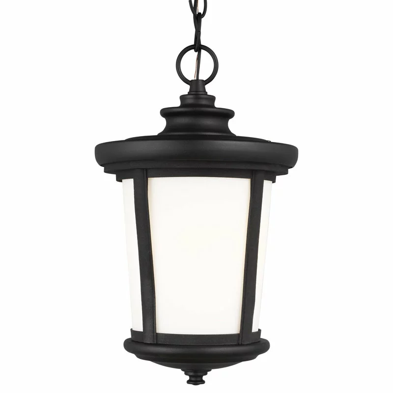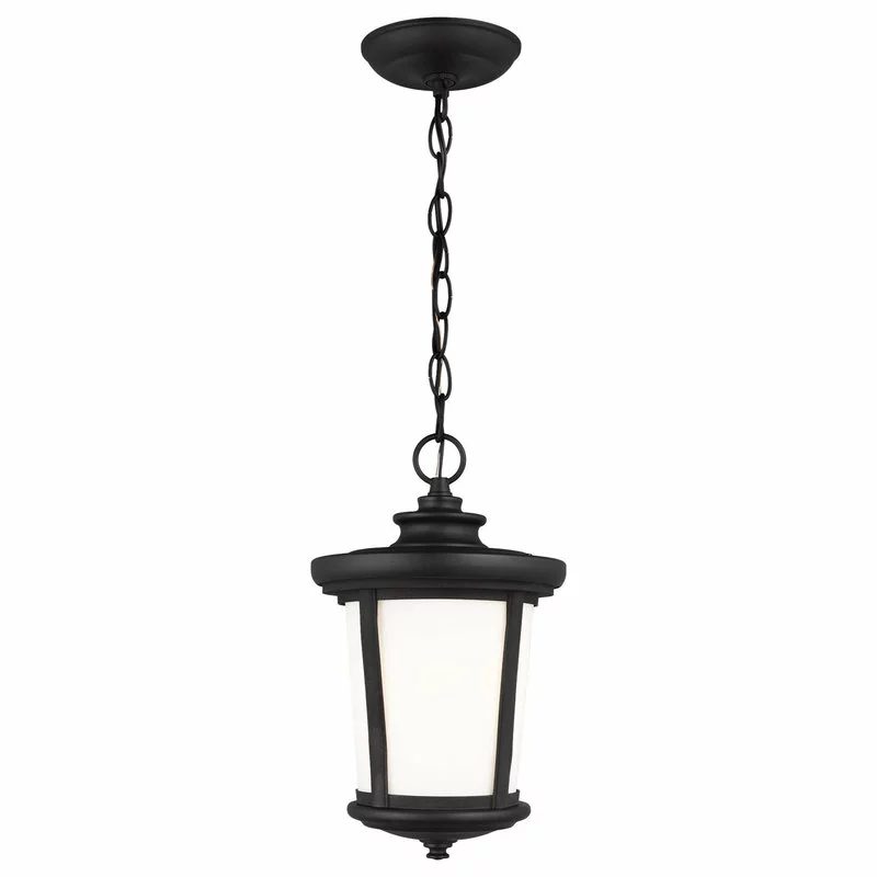 The Sea Gull Lighting Eddington one light outdoor pendant fixture in black creates a warm and inviting welcome presentation for your home’s exterior.