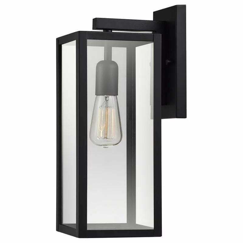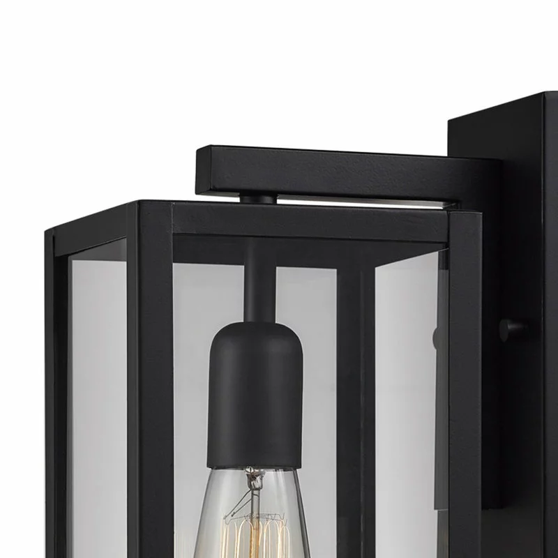 Clean lines and clear glass panels bring the Bowery Outdoor Wall Sconce into the modern era. A vintage-inspired bulb would add the right embellishment to make this piece truly a work of art. The matte black finish complements all decor and showcases your bulb in just the right way. This piece has such clean lines you can use it indoors too! A Globe Electric designer vintage bulb will complete the look. To create a finished look, pair this piece up to have symmetry at your front door. Includes all mounting hardware for quick and easy installation and requires one E26/medium base 60-watt bulb (sold separately).