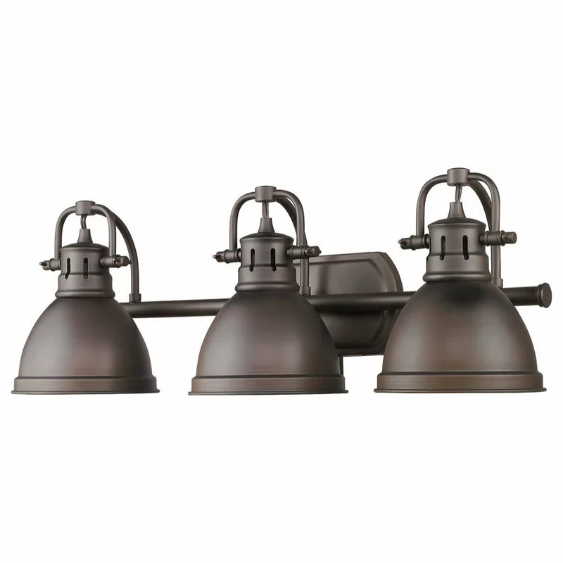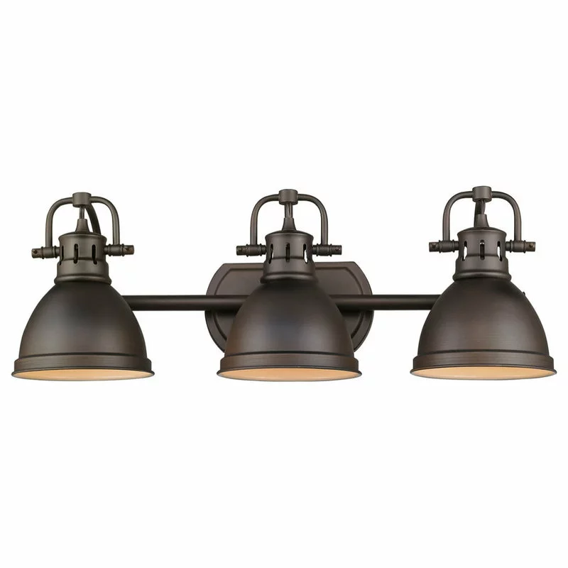 Transform the look of your room with this classic, vintage-inspired fixture by Golden Lighting. Golden Lighting’s Duncan collection is contemporary style with an industrial feel. The collection features a variety of simple, traditional silhouettes that are a nod to a bygone era. A variety of plated and painted metal shade finishes are offered in combination with durable Aged Brass, Chrome or Pewter fixture bodies. Rubbed Bronze fixtures are paired with Rubbed Bronze shades. This 3 light bath vanity is UL approved for use in a bathroom. The style is perfect for modern or contemporary home decors.