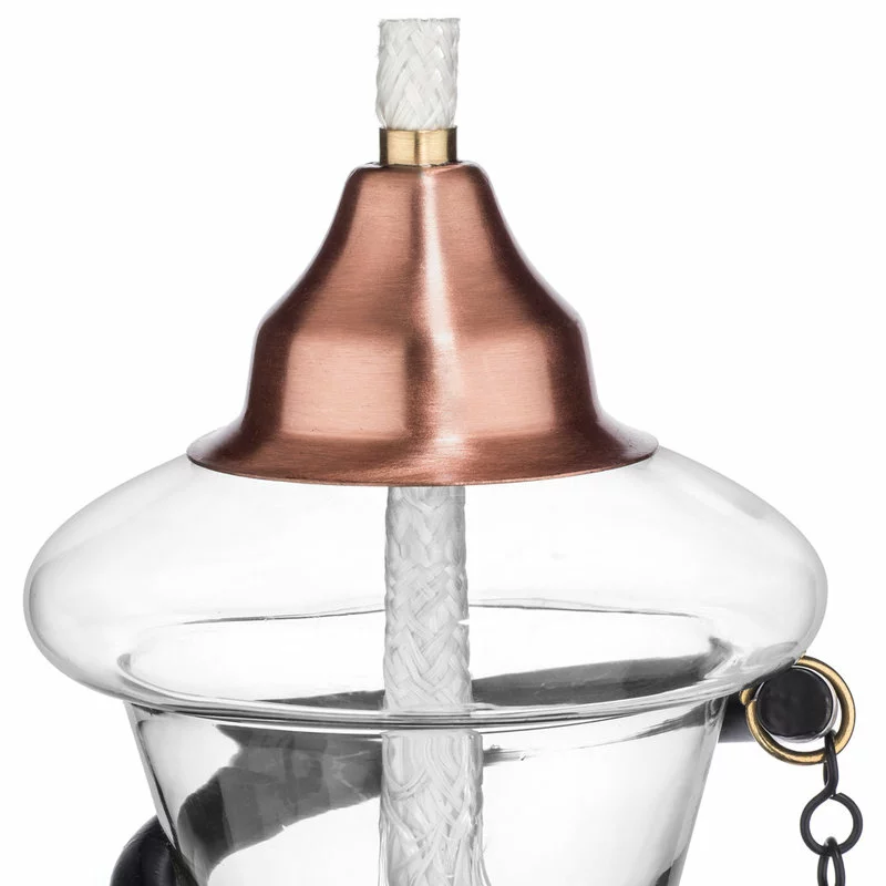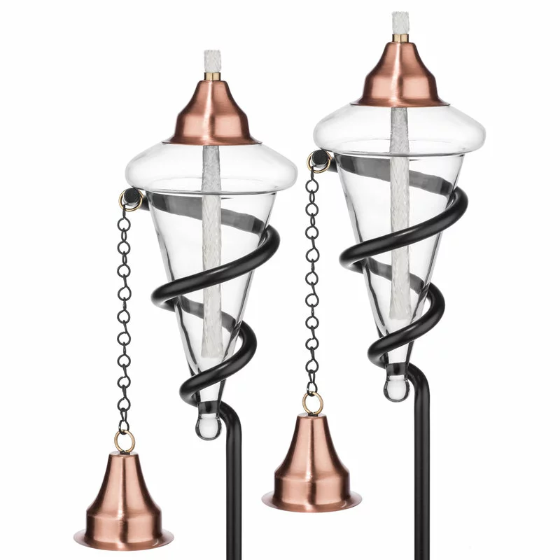 GLASS – COPPER – ALL-WEATHER METAL POLE– Hand-blown glass reservoir with copper top and long lasting nylon wick holds 22 ounces of fuel and sits securely within the black powder-coated spiral metal frame. Brass chain attaches copper snuffer cap, sturdy yet stylish. Glass torch easily slides out of the outdoor lighting holder for easy torch oil replacement and cleaning. Oil not included, we recommend a clear burning oil of choice; for insect control consider lemon eucalyptus or citronella.