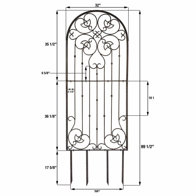 SECURELY PACKAGED AND BUILT TO LAST – Professionally packaged into three pieces requiring assembly, the iron trellis is pleasing to the eye and perfect for growing vines or purchased as a pair to create private space. With dimensions of 32 inches wide by 72 inches high (plus 17.5 inch ground spikes) this heavy-duty trellis offers a secure anchoring system that will happily support large plant material.