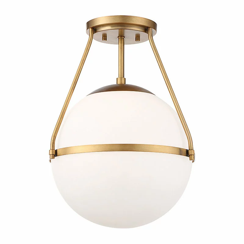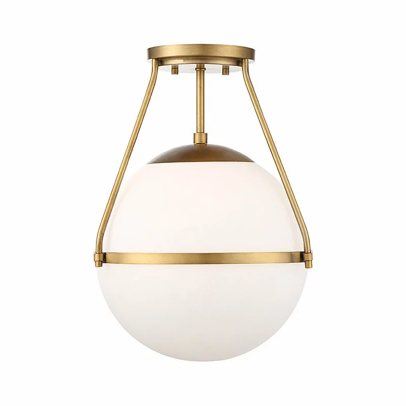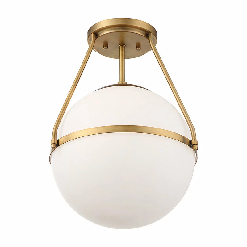 Find a gorgeous, retro-inspired glow with this semi-flush mount light. Its orb shade of white opal glass wears a thin metal band accent that adds another little touch of style.