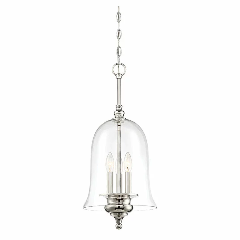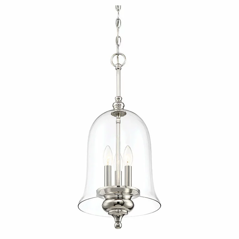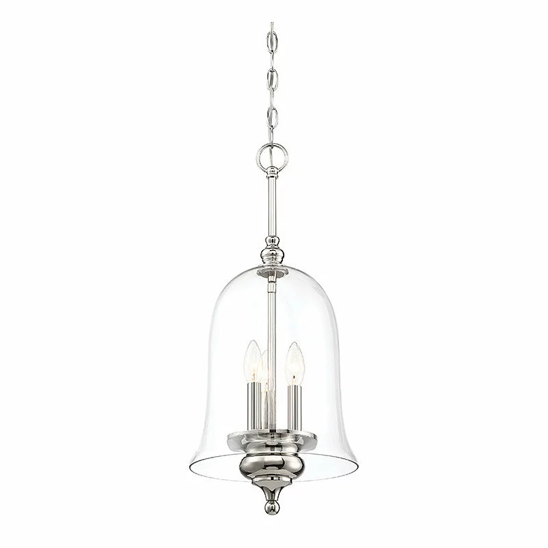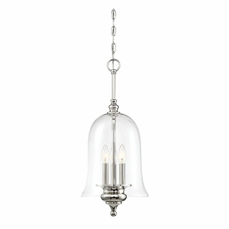 This pendant features a bell-shaped clear glass shade that protects the light sources within but is open at the bottom, allowing the finial detail to be fully showcased.
