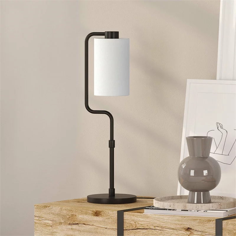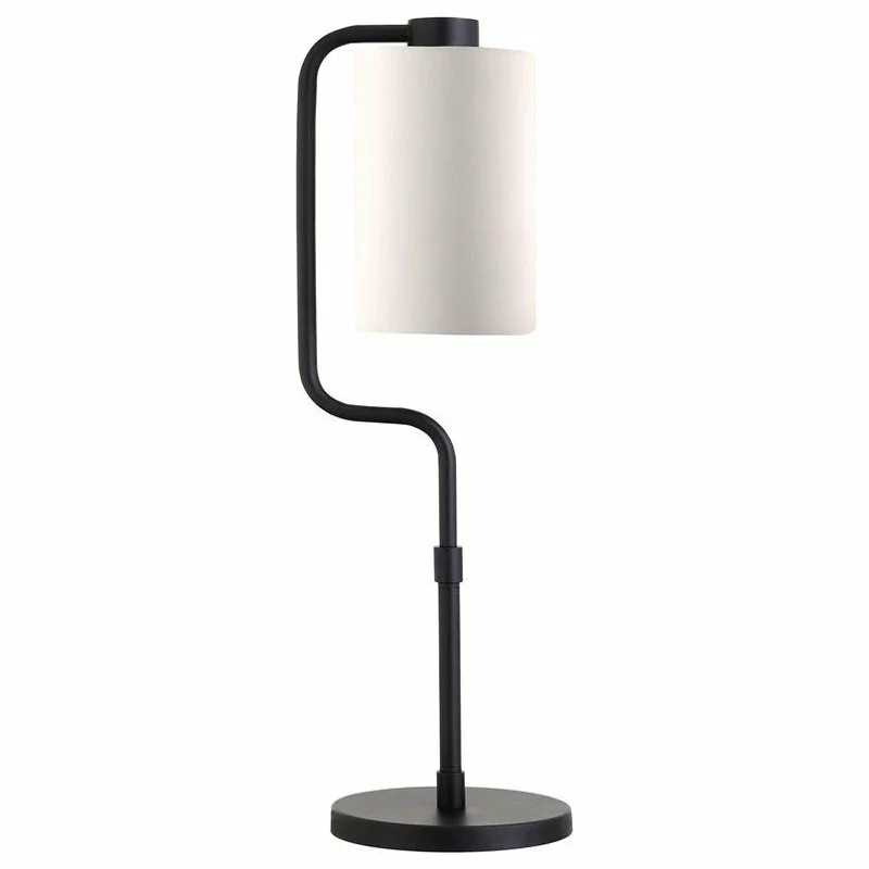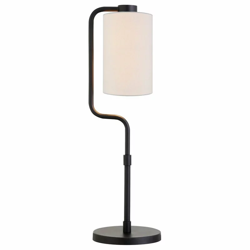 Add visual interest to any room with this lantern-inspired table lamp featuring modern asymmetrical curves. The steel base is finished in a classic neutral tone to match nearly any color scheme. A long, cylindrical shade of white linen emphasizes the lamp’s verticality and creates a sleek finish for your eclectic space.