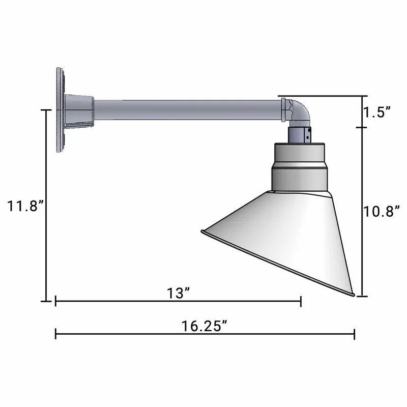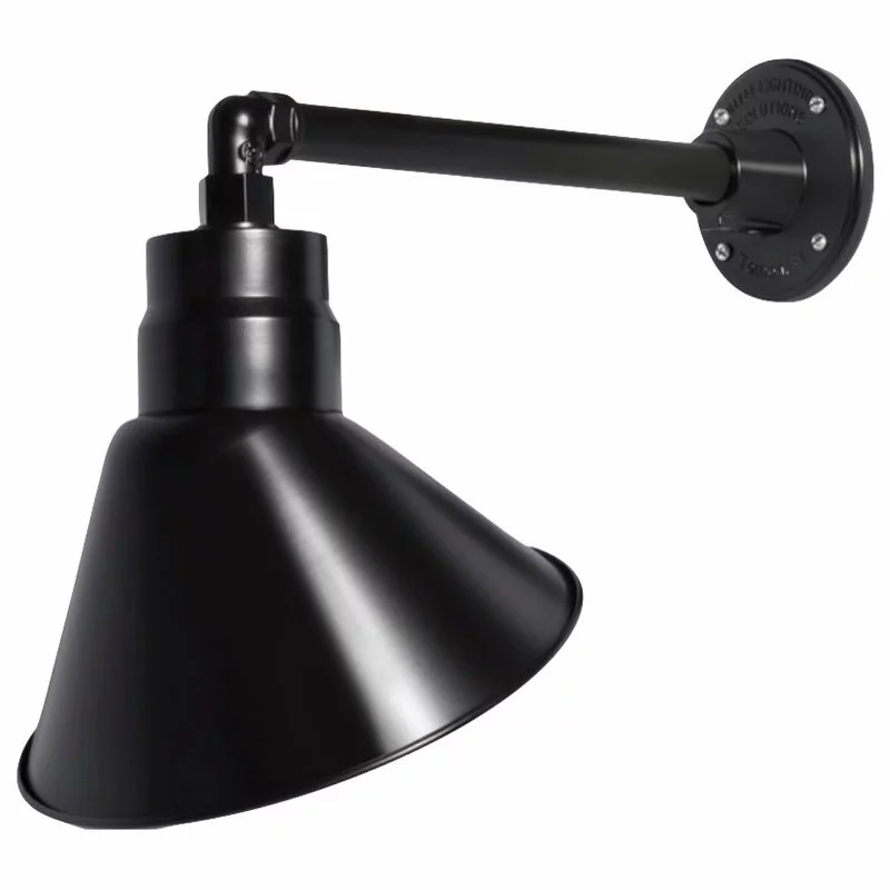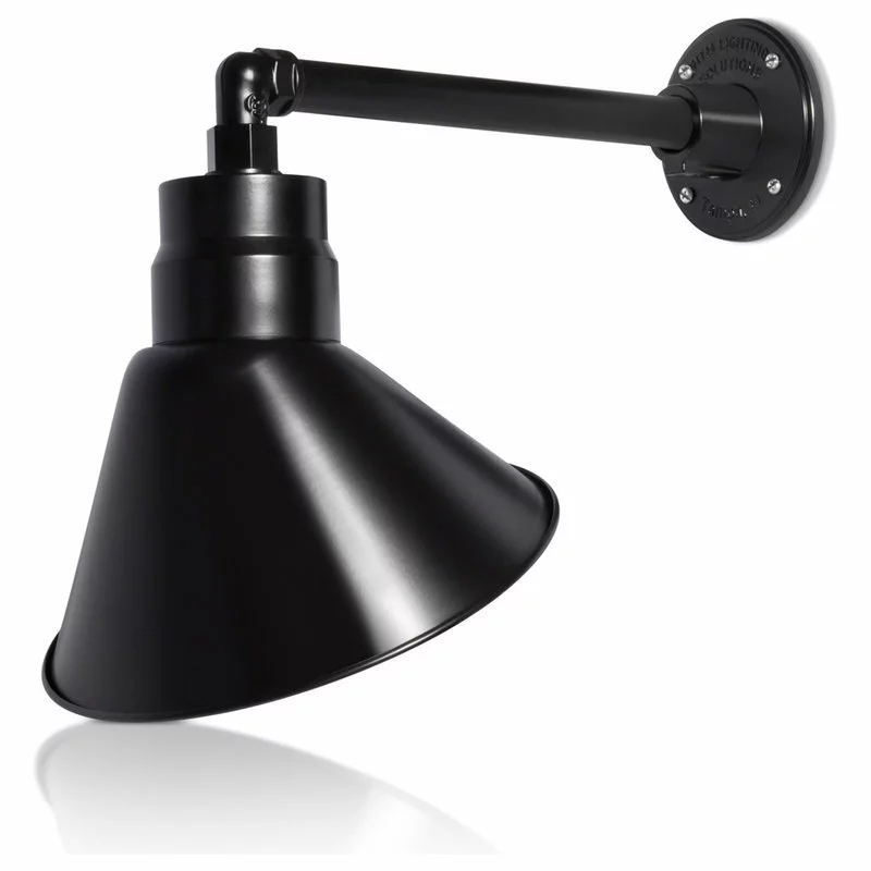 The 10in. Satin Black Angle Shade is 10in. Diameter, and 10-3/4in. Height. Fovero RLM’s are UL Listed for Wet Locations [E502113] when using Gooseneck Arms, or Stems and are professionally manufactured using durable cold rolled steel material and die cast zinc. Each shade comes with a wire length of 96in. which makes it very easy to install, and can take up to an E26 Medium Base 200W A21 Incandescent Bulb, or just about any standard LED Bulb. The Architectural Bronze, Satin Black, and White RLM Shades are electrostatically sprayed, prior to being oven baked with reliable UV stabilized paint which is suitable for indoor and outdoor use. All shades, at the exception of the Galvanized, incorporate white liners for increased light reflectivity. The gooseneck arms are 3/4in. Inside Diameter, with a No. 1-14 Thread, and are available in lengths ranging from 10in. long all the way to 41in. long. The gooseneck arms are sold with a 4.5in. diameter mounting plate intended for a heavy-duty round weatherproof junction box and come with 5x 8-32 x 1” Philips Head Screws, UL Listed Wire Cap Nut Connector, Waterproof Plug, Allen Key, and a Rubber Gasket to act as a sealant. Some common application for Gooseneck RLM’s are: