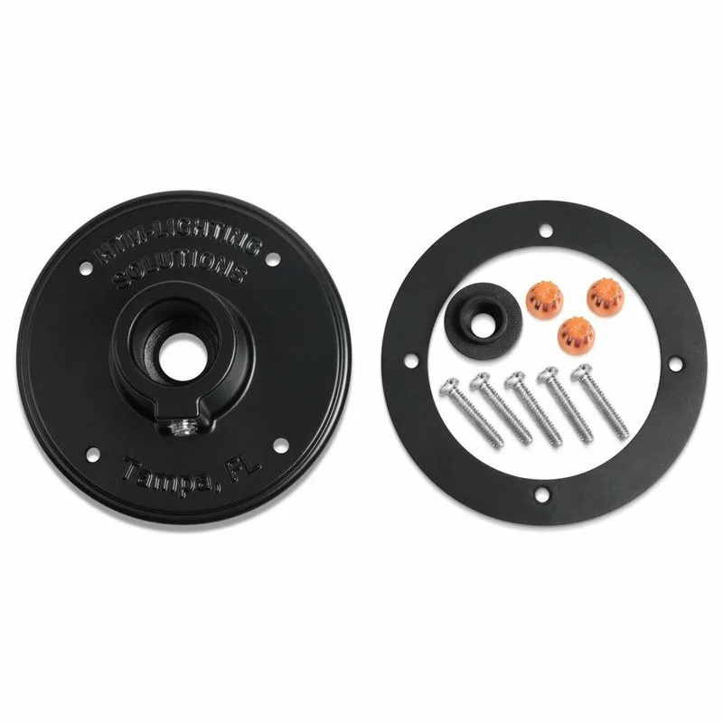 The gooseneck arms are sold with a 4.5in. diameter mounting plate intended for a heavy-duty round weatherproof junction box and come with 5x 10-24 x 1” Philips Head Screws, UL Listed Wire Cap Nut Connector, Waterproof Plug, Allen Key, and a Rubber Gasket to act as a sealant.