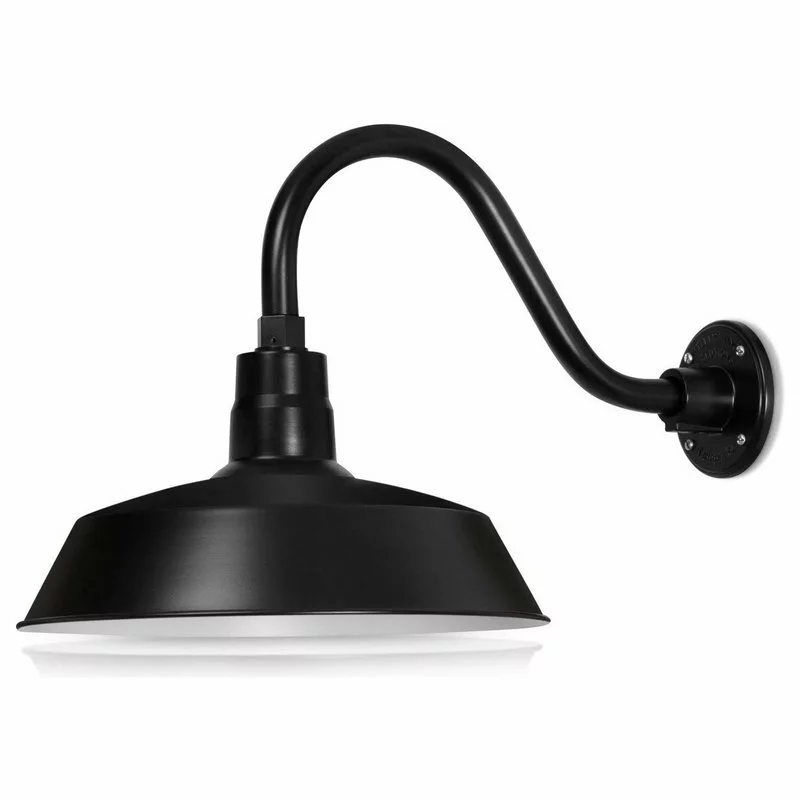 - The Sleek 14in. Satin Black Warehouse Shade, also referred to as Gooseneck Barn Light is 14in. Diameter, and 8in. Height.