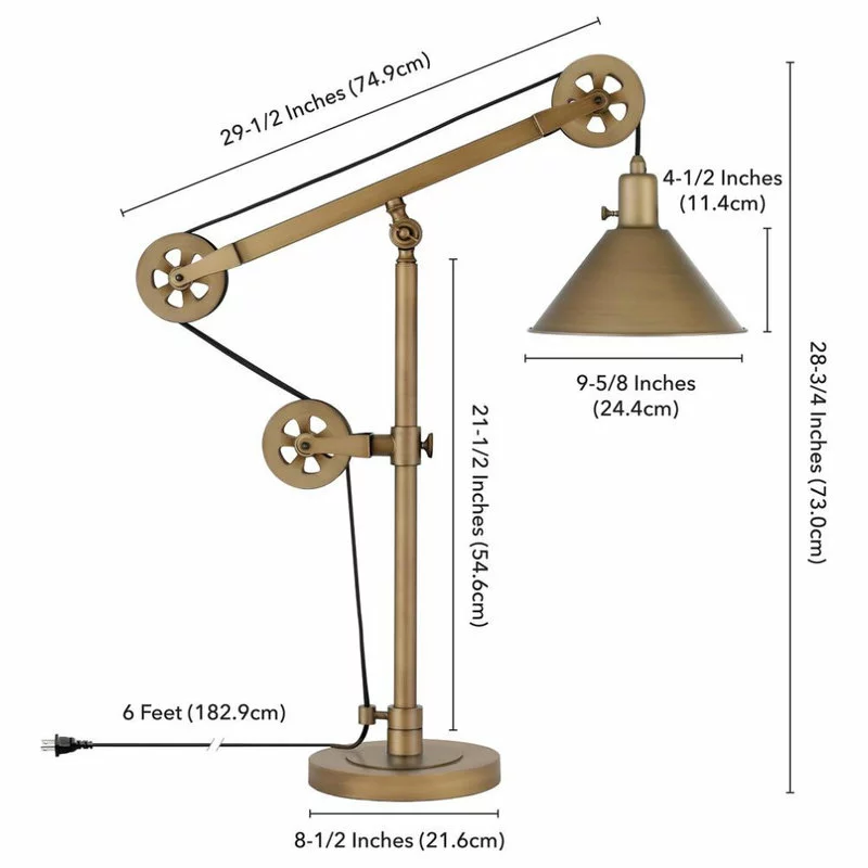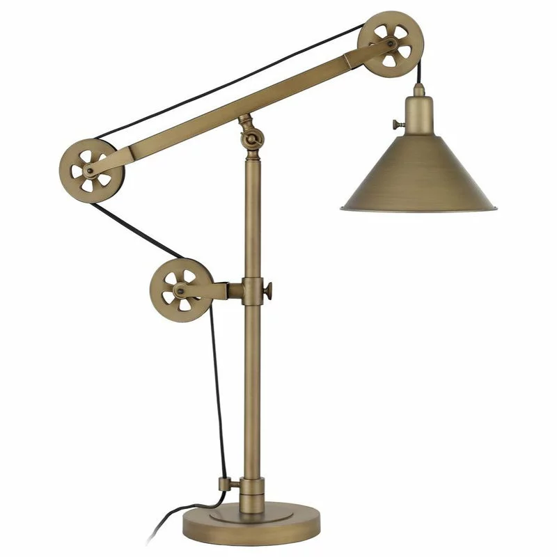 This brass table lamp counterbalances function and design. It features an adjustable pulley system allowing you to personalize your space.