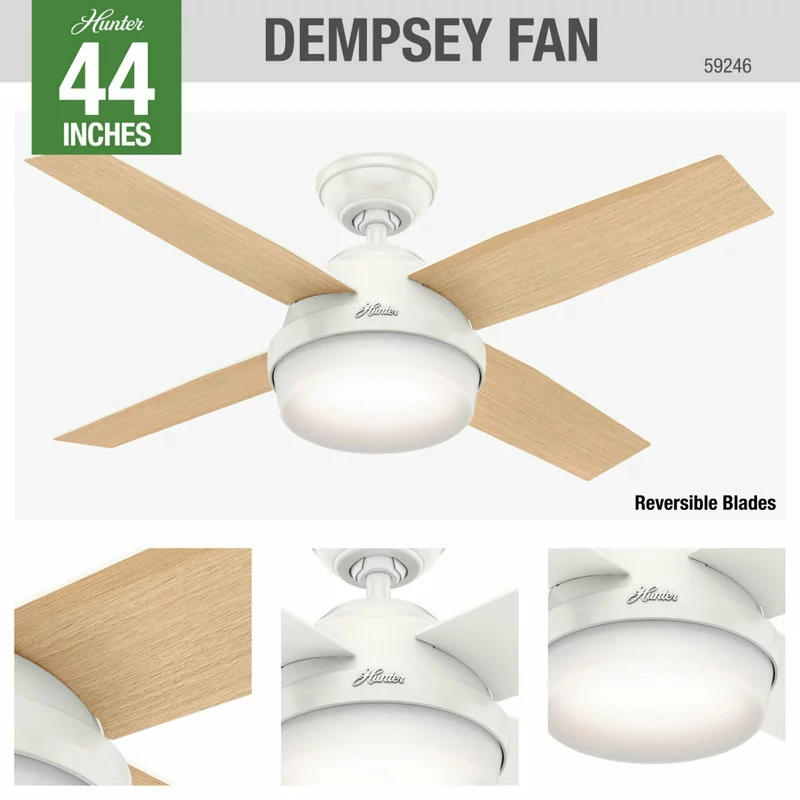 A contemporary fan with mass appeal, the Dempsey will fit flawlessly in your home’s modern interior design. The beautiful, clean finish options work together with the high contrast of angles throughout the design to create a look that will keep your space looking current and inspired. Fully-dimmable, energy-efficient LED bulbs give you total control over your lighting, while the 44-inch blade span is ideal for small rooms. We have a full collection of Dempsey fans so you can maintain a consistent look while tailoring the size and features to each room in your house.