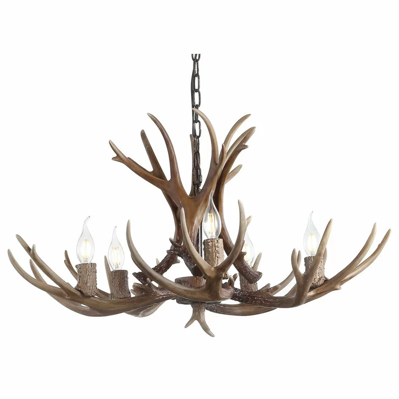 This faux antler chandelier transports us to our dream mountain home, bringing nature inside with a contemporary rustic touch. Featuring an adjustable metal pull, it can be adjusted to your ceiling height for a semi-custom look. Each unique finish brings a refreshing quality to this beautiful piece.