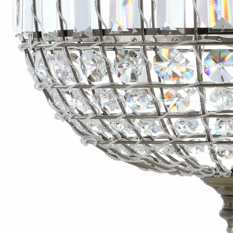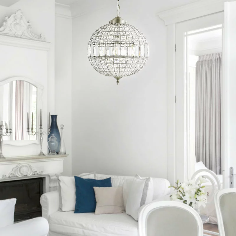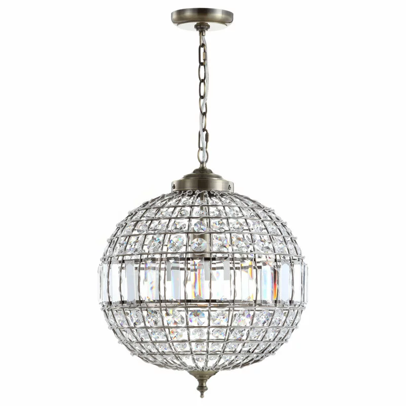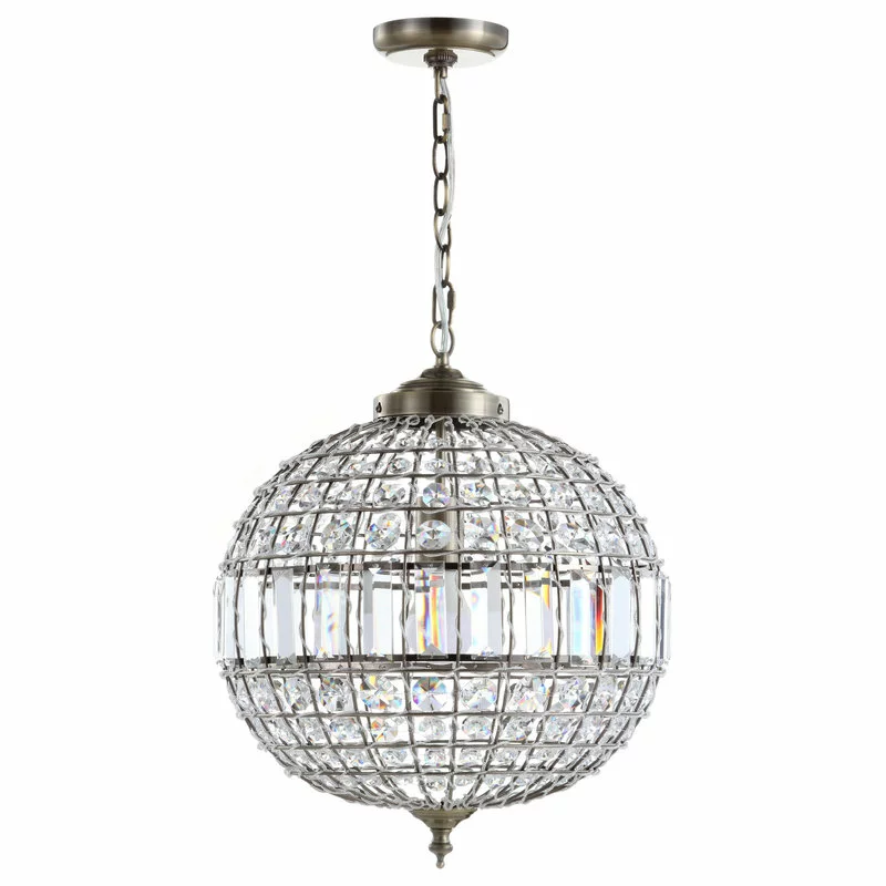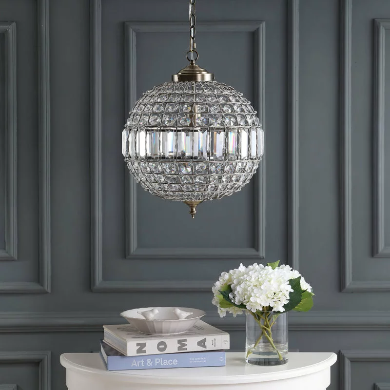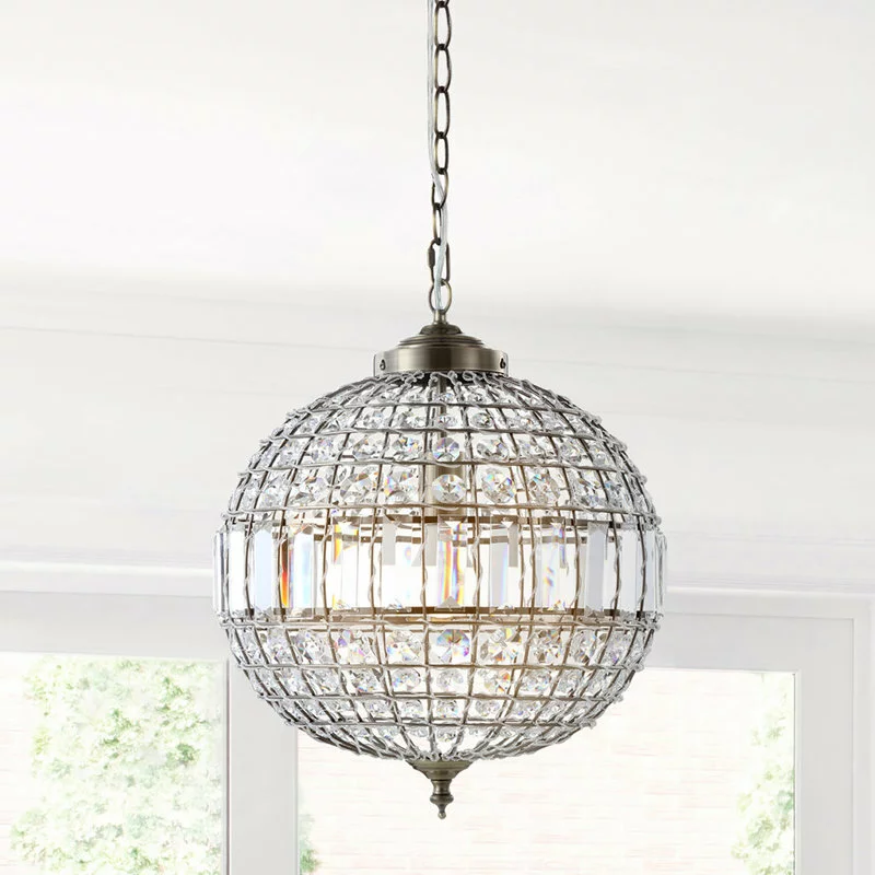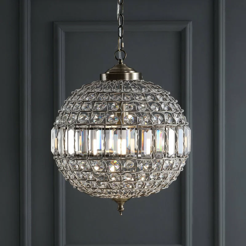Classic elegance exudes from this finely designed and crafted crystal pendant. With a classic globe shape and antique brass fittings, the addition of faceted crystals into all the open spaces creates a glamorous effect. With one bulb concealed within its sphere and a fully adjustable chain length, this fixture could be equally at home in spaces big and small.