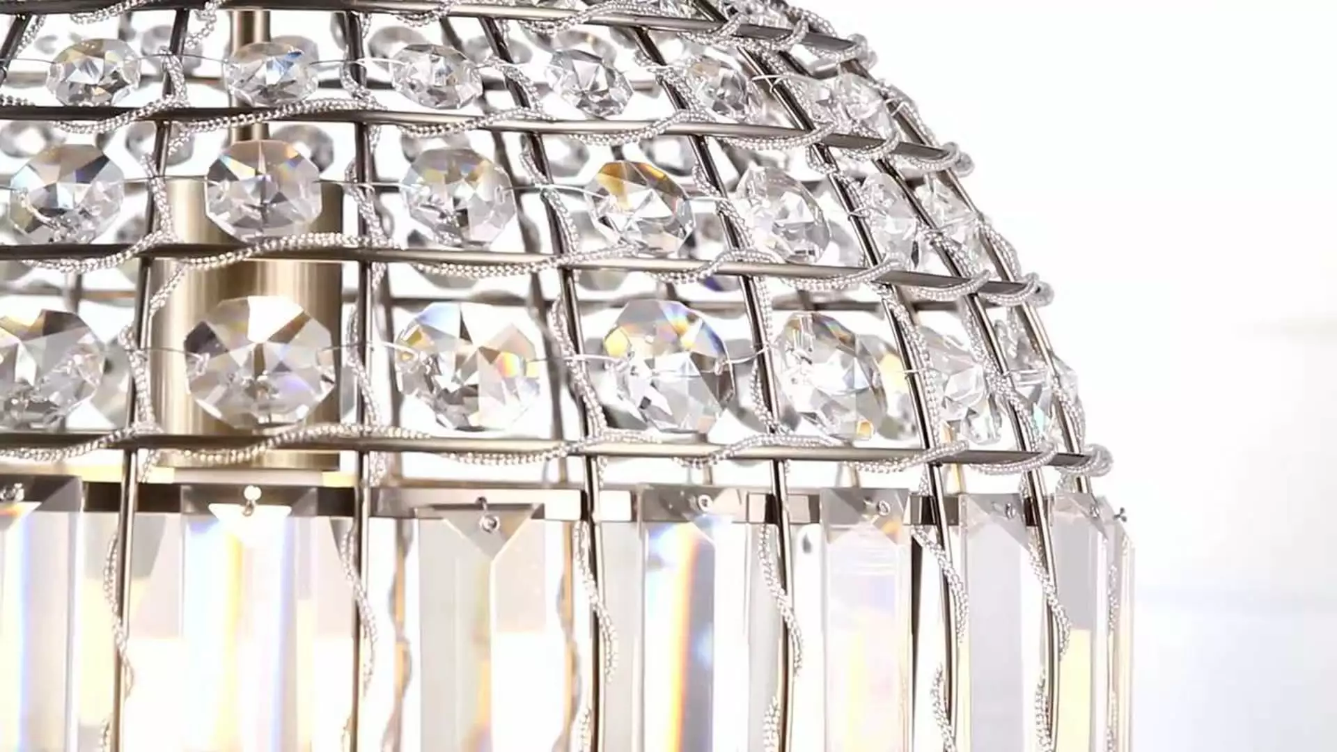 - Faceted crystals are meticulously hung in every space of the brass frame