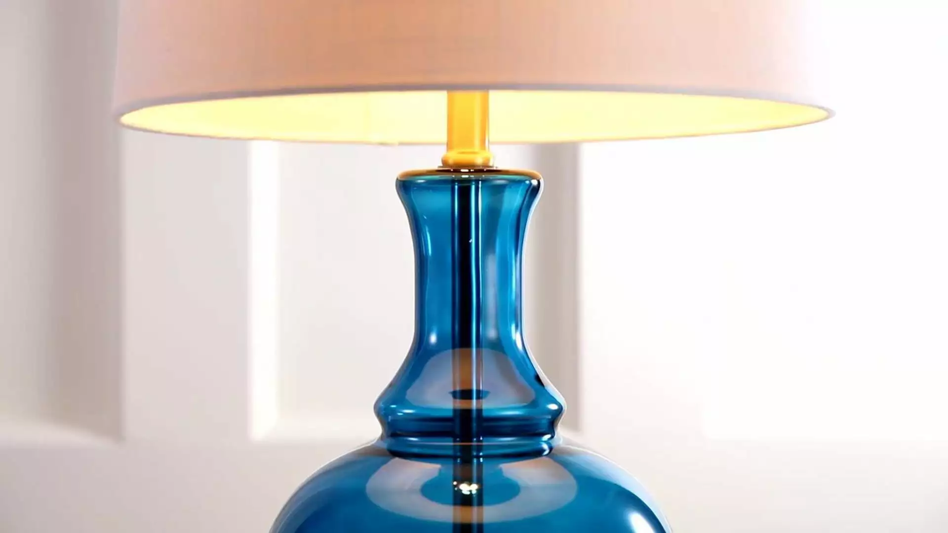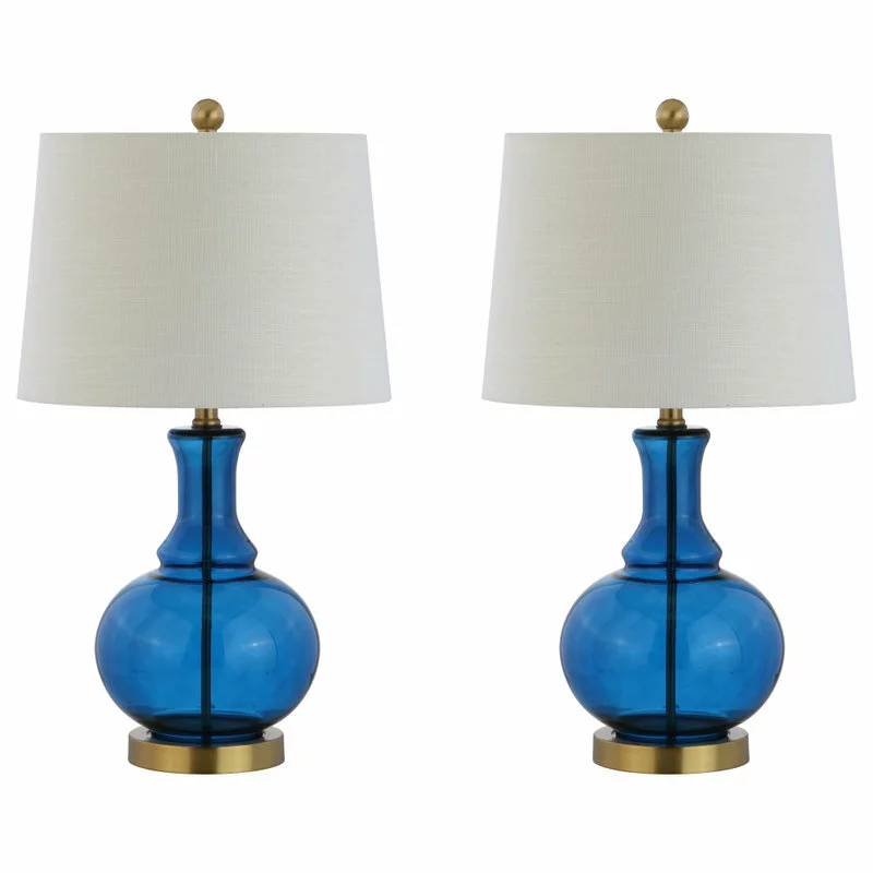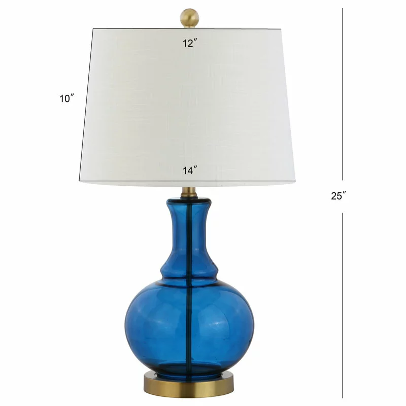 Classic curves accentuate hand-blown glass in this perfect combination of classic and contemporary. In an eye-catching blue glass and brass base, rod, and finial, no design detail was overlooked. Softened with a white linen drum shade and finished with a silk-wrapped cord, the style extends all the way to the plug.