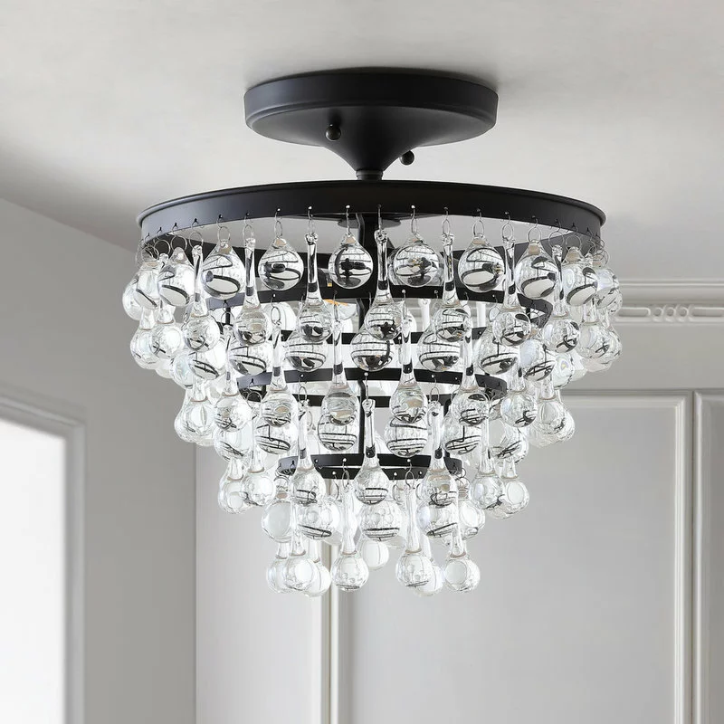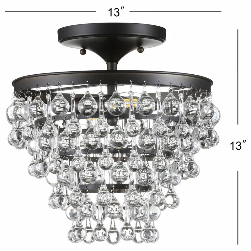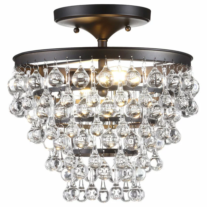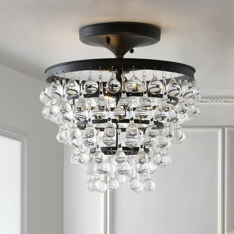 Turn on the charm in your room with this iron and crystal chandelier, where the teardrop-shaped crystals seem to drop off the round frame. The orb finish lends an industrial base, while the crystal components add romance and classic glamour. At 13″ wide, it is scaled perfectly for small to medium sized rooms — we love hanging this bestseller in unexpected nooks such as bathrooms and walk-in closets for a dash of drama.
