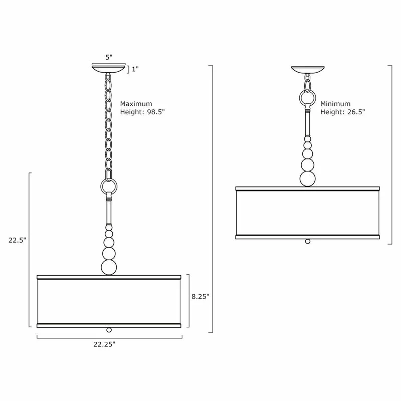 - DIMENSIONS: Chandelier: 22.5″ (H) x 22.25″ (D), Canopy: 5″ (D) x 1″ (H), Drum Shade: 8.25″ (H) x 22.25″ (D). Includes 72″ of adjustable chain for desired hanging height. Minimum/Maximum: 26.5″ – 98.5″