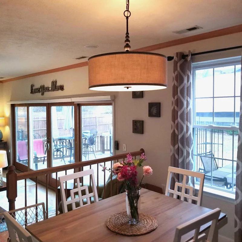 Indoor/Outdoor Usage: IndoorLighting Direction: Up/Down LightLighting Source Type: Incandescent, LED, CFLMounting Style: CeilingSafety Rating: UL ListedLocation Rating: DryShade Shape: DrumShade Material: FabricFinish Type: PaintedRecommended Room Type: Indoor, Home, Kitchen, Foyer, Dining Room, Living Room, Bedroom, Entryway, Hallway, Stairway, EntrySpecial Feature: Dimmable, Sloped Ceiling Compatible