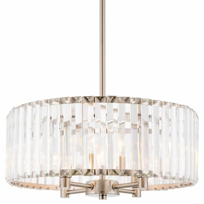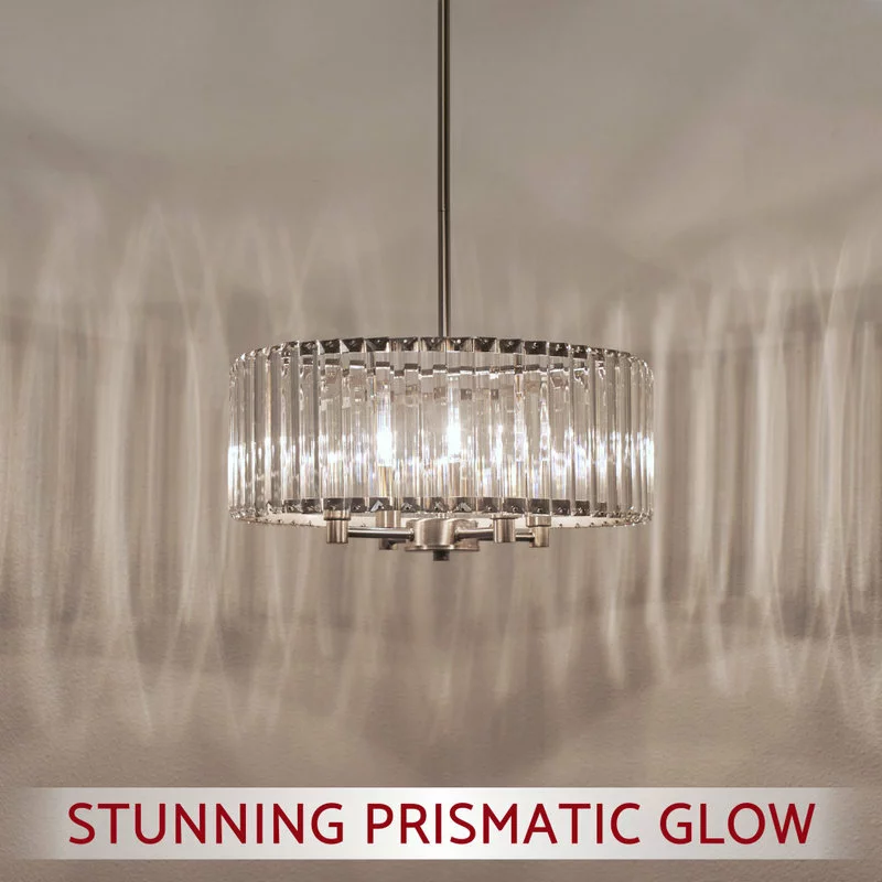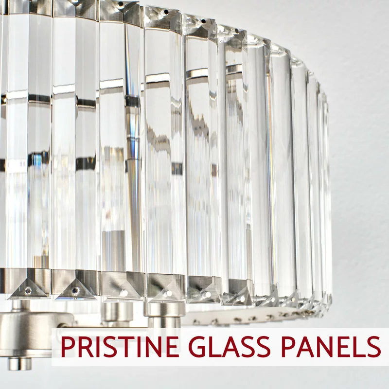 - MODERN LUXURIOUS STYLE: Gorgeous crystal chandelier is showcased by beveled glass panels on the outer drum shade, allowing light to reflect it in many directions. Spruce up your home with this classy, sophisticated piece sure to be a conversation starter