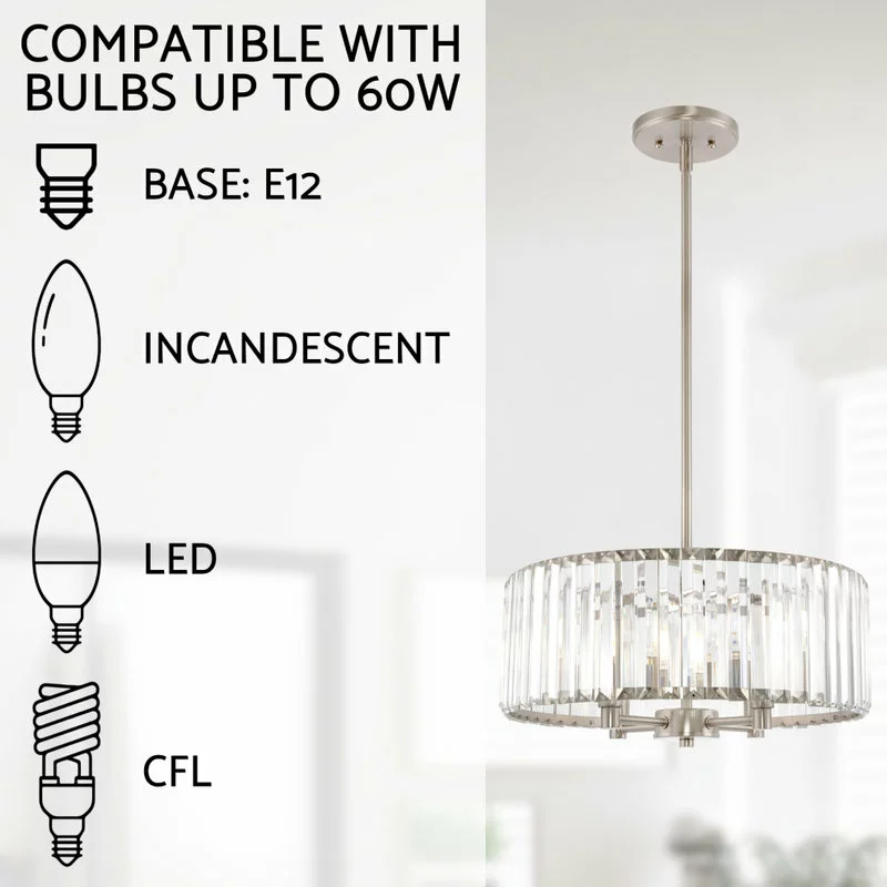 Kira Home’s Delilah 16″ 4-light modern crystal chandelier showcases a sleek, upscale design becoming an instant conversation starter amongst family and friends. Complete with high quality materials, Delilah includes stunning drum shade composed of beveled glass panels. These pristine glass panels refract light, projecting stunning prisms of light in multiple directions. With its refined brushed nickel finish and eye-catching style that transcends time, Delilah will add luxury to a variety of interior styles and decors ranging from vintage and retro to modern and contemporary. Drawing from old Hollywood glam and 1930s art deco, this piece is not just decorative, it is artistic! Customize this piece and adjust hanging heights to your liking as 48 inches of downrod is included, giving it a minimum/maximum hanging height of 15.5″ to 57.5″. Brighten up even the darkest of spaces including over a dining room table, above a kitchen island or breakfast nook or simply to spruce up a foyer or stairway. Need to set the mood? Delilah works with standard dimmer switches when paired with compatible bulbs. This hanging chandelier is also sloped/slanted ceiling compatible to suit your needs. Unlike many of our competitors, Delilah is UL approved for your safety.