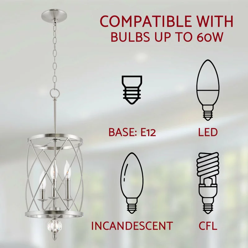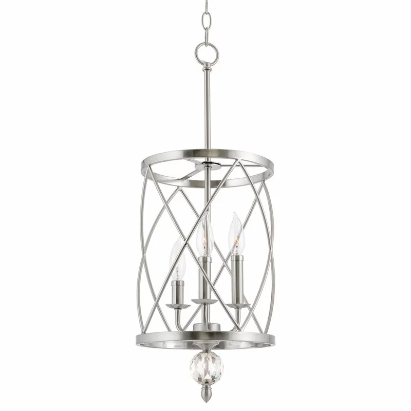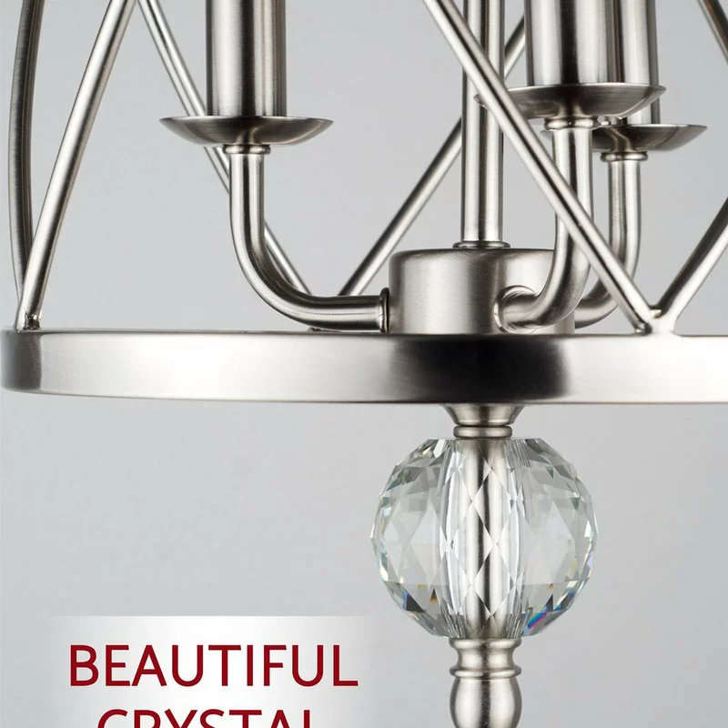- SOPHISTICATED STYLE: Unique cylindrical lattice cage chandelier pendant light encompasses three candelabra base sockets varying in size. Features thick metal shade, glass crystal finial, brushed nickel finish and adjustable height to elevate your space