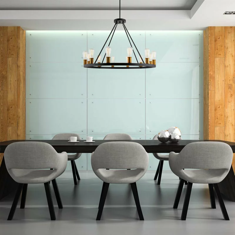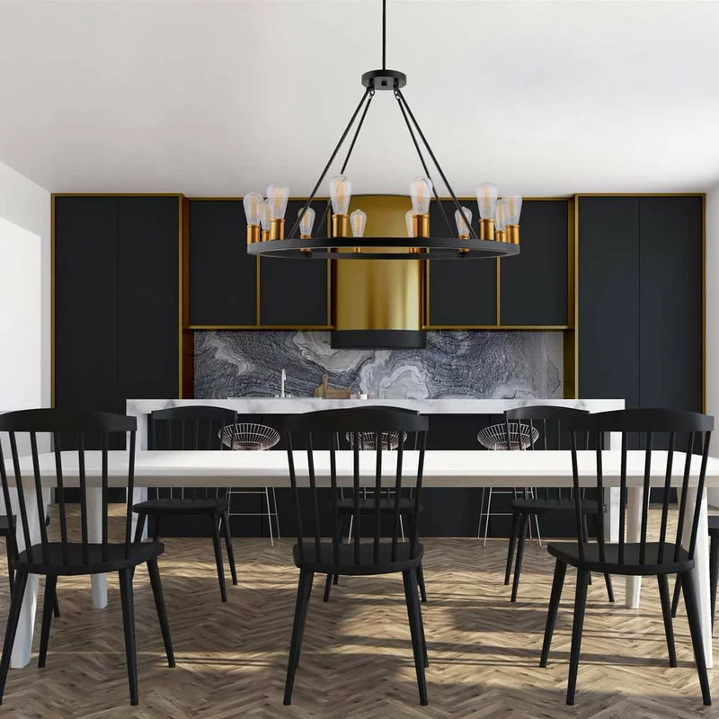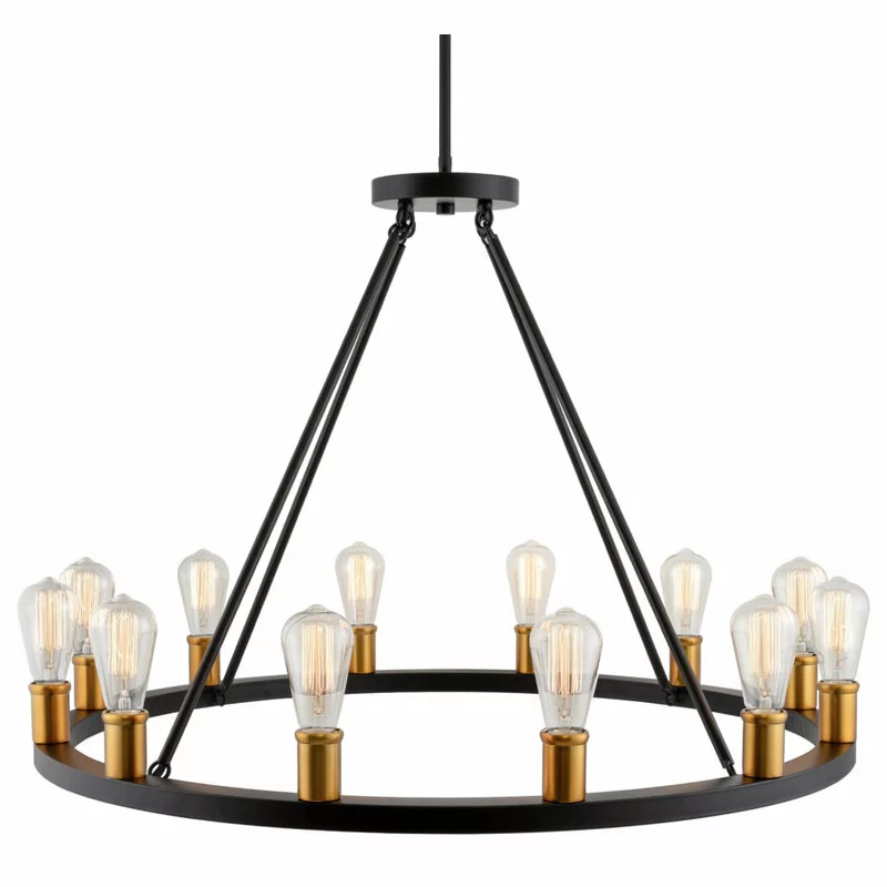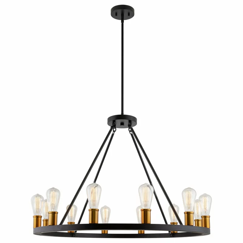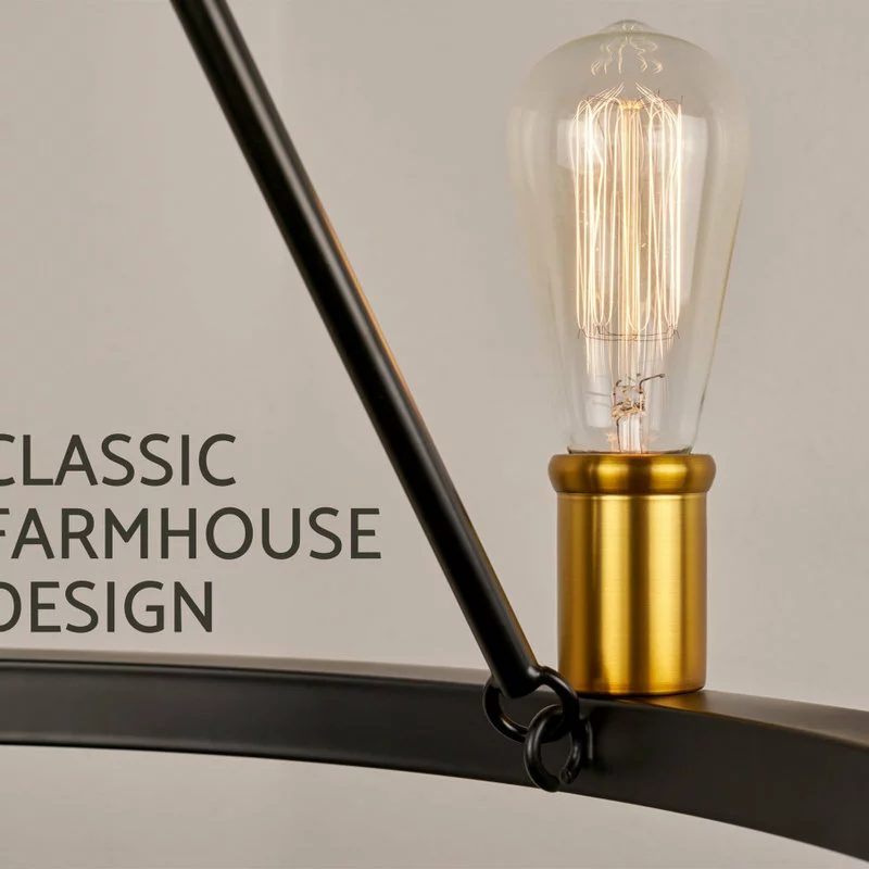 Kira Home’s Jericho 36″ 12-light rustic farmhouse kitchen island chandelier showcases an impactful and innovative design. With its beautiful wagon wheel design, this large hanging light will be an instant conversation piece amongst family and friends. Constructed with durable, high quality materials, Jericho includes a stunning, circular metal frame in a classic black finish and warm brass accents. With modern country appeal, this heavy duty fixture suits a wide range of interior styles and decors ranging from modern and transitional to rustic and spanish style. Hang the Jericho chandelier in dining rooms over tables, above a kitchen island or large kitchen counter. Suspend over seating areas for additional lighting. Ideal lighting in a game room over a pool table. Adjust hanging heights to your preference as adjustable downrods are included, allowing for a minimum/maximum height of 27.75″ to 69.75″. Need to set the mood? Jericho works with standard dimmer switches when paired with compatible bulbs, and if you’re looking for a vintage look and feel, choose bulbs with an Edison style.This hanging chandelier is also sloped/slanted ceiling compatible to suit your needs. Unlike our low priced competitors, Jericho is ETL approved for your safety.