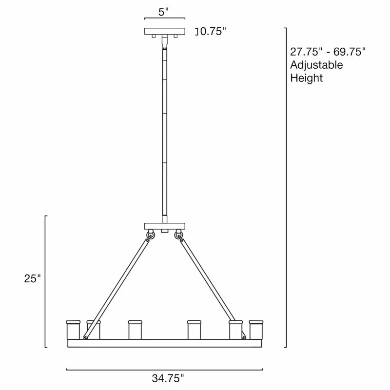 - DIMENSIONS: Farmhouse Chandelier: 25″ (H) x 34.75″ (D), (36″ D with bulb), Canopy: 5″ (D) x 0.75″ (H), Wagon Wheel: 3.75″ (H) x 34.75″ (D). Includes (1) 6″ and (3) 12″ downrods for desired hanging height. Minimum/Maximum: 27.75″ – 69.75″