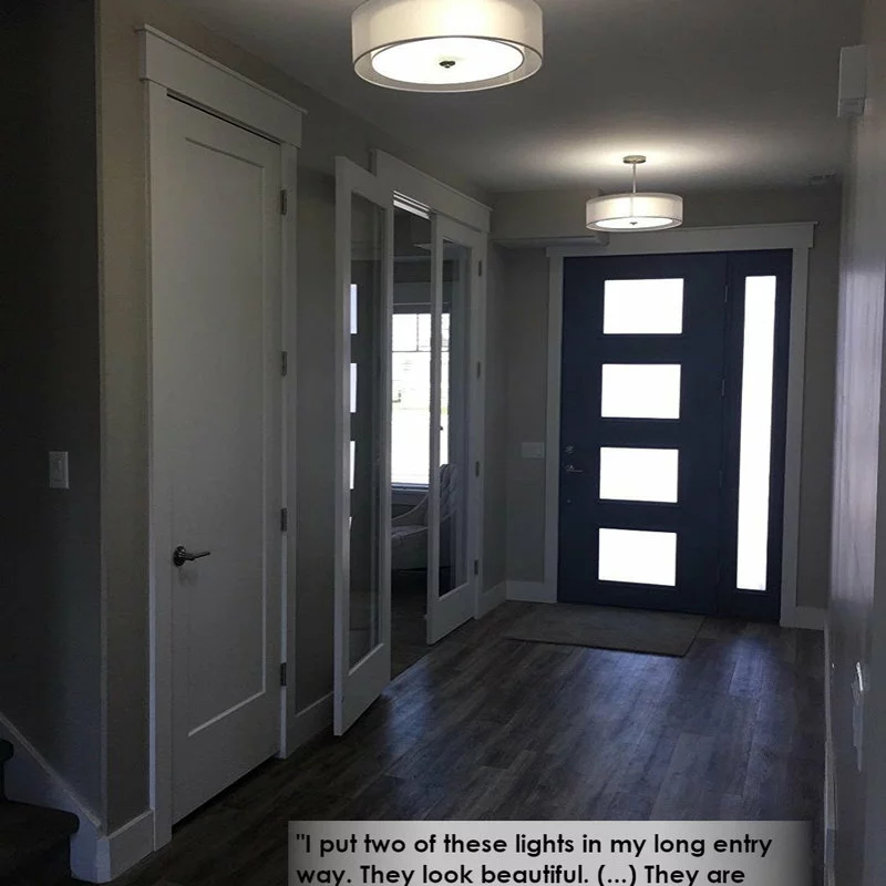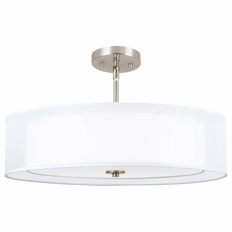 Indoor/Outdoor Usage: IndoorLighting Direction: Up/Down LightLighting Source Type: Incandescent, LED, CFLMounting Style: CeilingSafety Rating: UL ListedLocation Rating: DryShade Shape: DrumShade Material: FabricFinish Type: BrushedRecommended Room Type: Indoor, Home, Living Room, Bedroom, Dining Room, Foyer, Hallway, Entryway, Stairway, Kitchen IslandSpecial Feature: Dimmer Compatible
