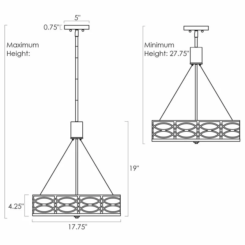 - DIMENSIONS: Chandelier: 19″ (H) x 17.75″ (D), Shade: 17.75″ (D) x 4.25″ (H), Canopy: 5″ (D) x 0.75″ (H). Includes (2) 6″ and (3) 12″ downrods for desired hanging height. Minimum/Maximum: 27.75″-69.5″
