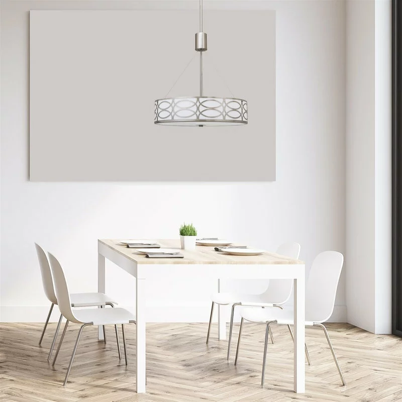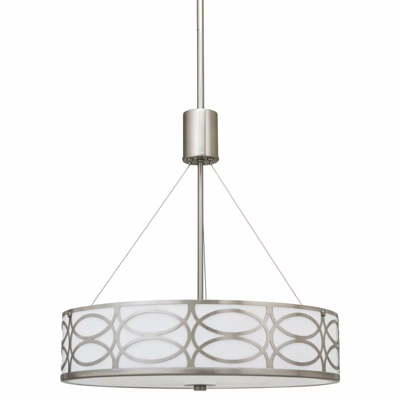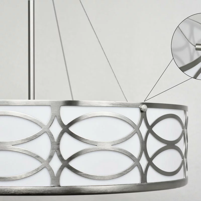 - TRANSITIONAL STYLE: Chandelier features a metal drum shade, glass diffuser and brushed nickel finish. The unique, intricate lattice design surrounding the sleek inner white shade provides a stylish, modern feel to elevate your home and decor