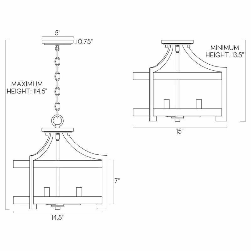 - DIMENSIONS: Semi Flush/Pendant Light: 15″ (D) x 13.5″ (H), Canopy: 5″ (D) x 0.75″ (H), Metal Drum Shade: 14.5″ (D) x 7″ (H). Includes 96″ of chain for desired hanging height. Minimum (Semi Flush)/Maximum (Pendant with chain): 13.5″ – 114.5″