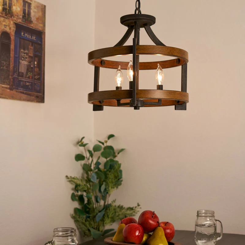 The Woodrow 15″ farmhouse convertible pendant light/semi flush mount adds a uniquely different style to your home. It features a standout walnut style finish paired with a beautiful textured black finish on an open cage design. Brimming with rustic charm and medieval style, Woodrow will brighten up even the darkest of rooms including dining rooms over tables or above a kitchen island or counter. Well constructed and durable, hang in hospitality settings like hotels and restaurants over cafe or bistro tables. Versatile in style, Woodrow will fit a variety of interiors and styles such as modern, Spanish, traditional, country, and more. Adjust the hanging height of this fixture to your preference as 8 feet of chain is included, allowing for minimum/maximum hanging height of 13.5″-114.5″. Mount as a close to ceiling light as a semi flush mount or as a pendant light. When used as a pendant light, Woodrow is also sloped/slanted ceiling compatible to suit your needs. Unlike many of our competitors, this convertible pendant light is ETL approved for your safety.