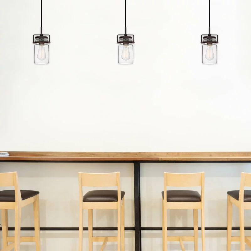 - VINTAGE FARMHOUSE FEEL: Unique hanging light gives an updated look to traditional canning style glass jars. The sleek, clear cylindrical shades rest within an oil rubbed bronze bracket design. Allow this light to radiate warmth to brighten your home
